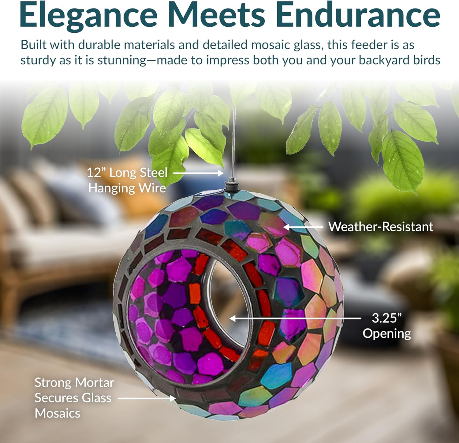 - ATTRACT BIRDS TO THE YARD: This cute bird feeder features vibrant colors and a mosaic glass construction that is sure to appeal to humans and birds alike. The bright colors and reflective material will help attract a variety of bird species to the feeder including cardinals, finches, sparrows, and more. Plus, it will add a stylish pop of color to any patio decor. The open fly-through design also makes it easier for birds to access the seed, encouraging them to come back again and again.