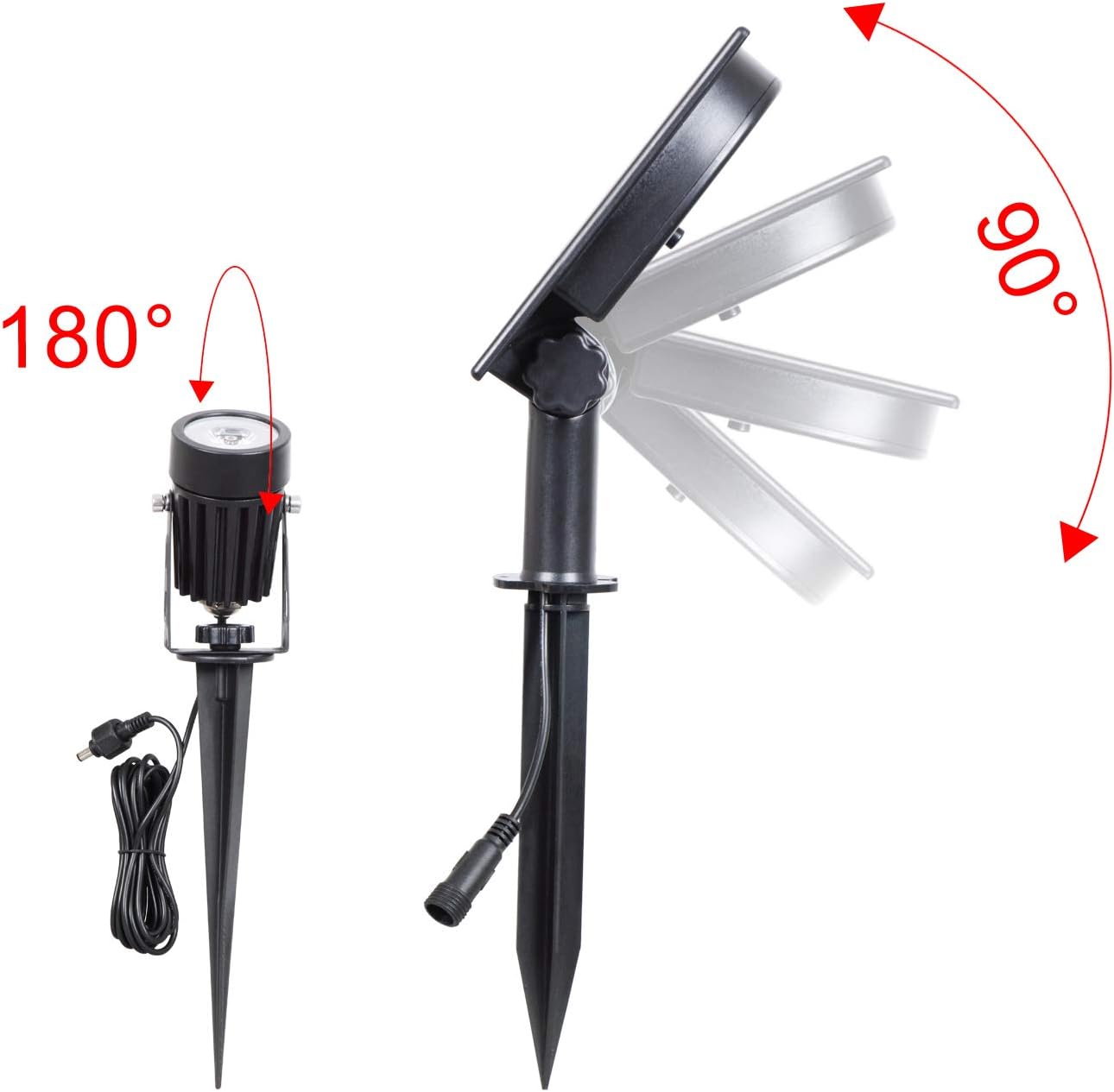 - 【Adjustable Solar panel & Light】 -- 90° for the solar panel, 180° for the light head. Solar panel will charge the battery during the day and light up automatically At the night.