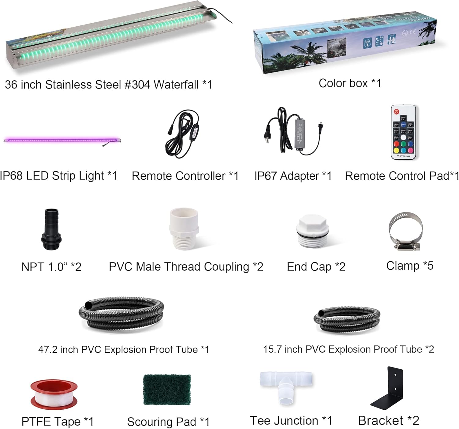 - Great Decoration - LED-lighted waterfall spillway makes your garden elegant, fashionable, and beautiful. The color changed as you like with the gentle sound of water running make your patio more special at night. It comes with a 304 stainless steel spillway, IP68 LED strip, IP67 adaptor, RF remote, supply cord, and 1.2” female PVC pipe adapter