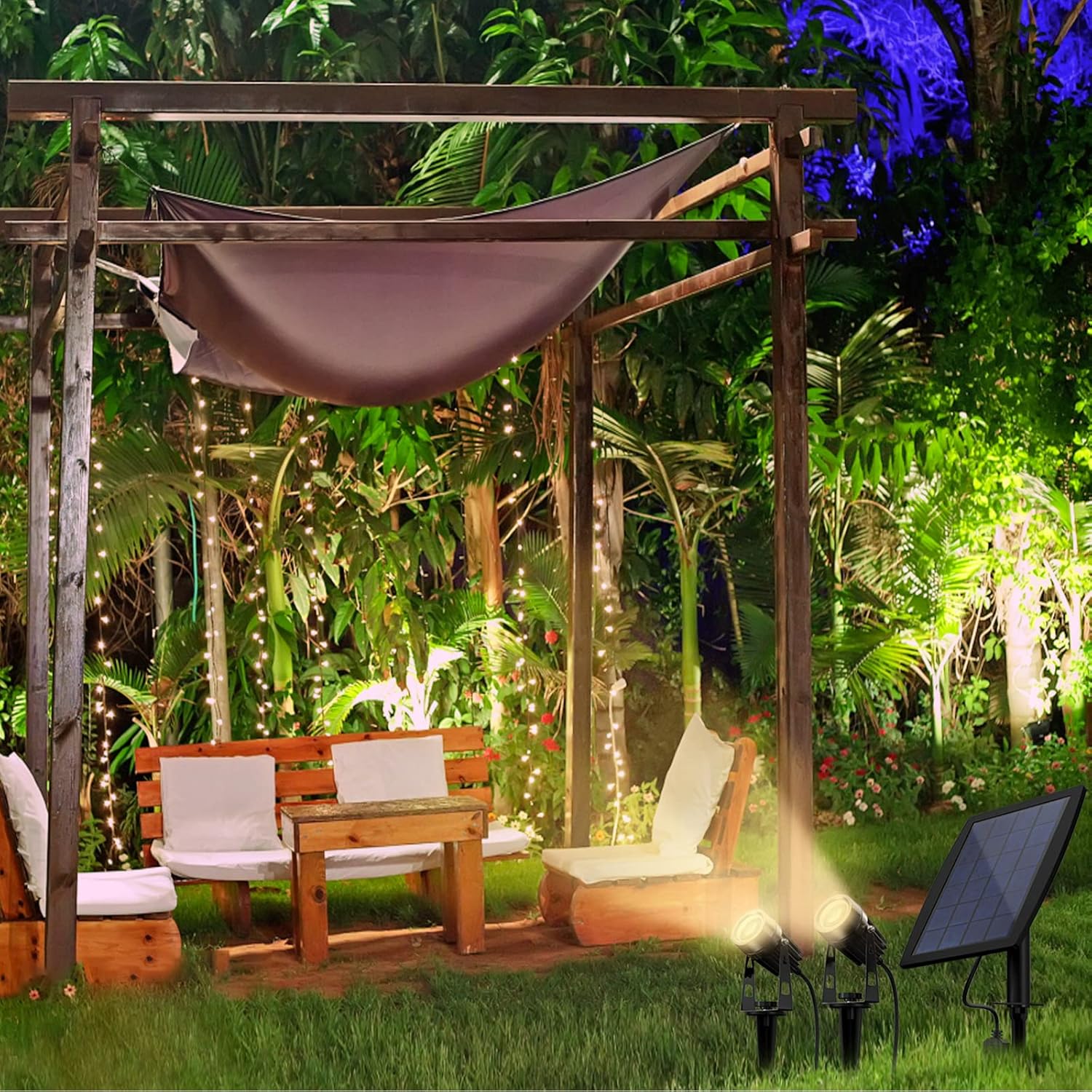 - FLEXIBLE & ADJUSTABLE: A separate solar panel allows solar spotlights outdoor for greater overall flexibility and avoids two lights' overexposure to the sun's rays, two lights with adjustable heads can be adjusted to 90° to highlight your garden for outdoor accent lighting. NOTE: The solar landscape lighting is Not Motion Sensor.