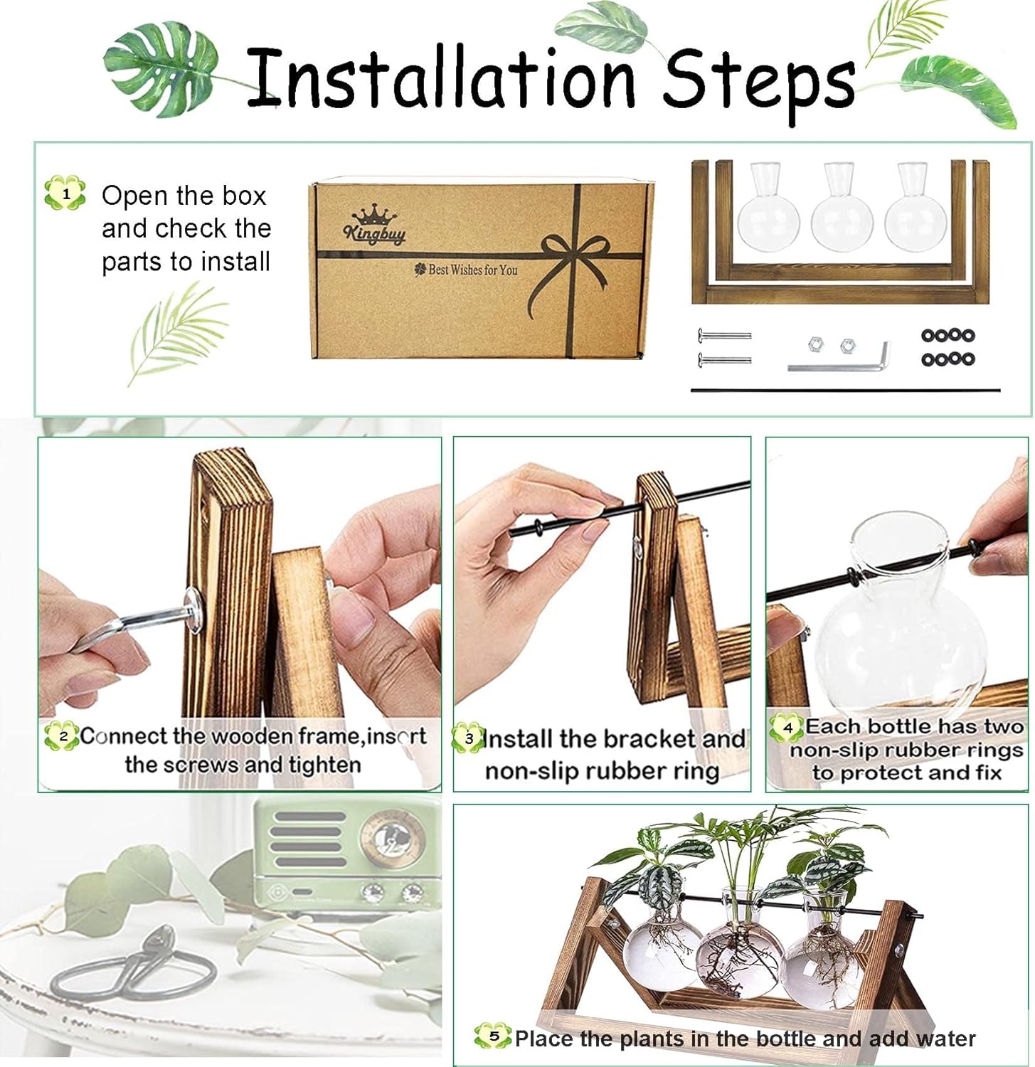 - Easy to Install: Easy to set up in 5 minutes (the hexagon screwdriver and screws are included). Just remove the glass vase or rotate it to pour the water, which is convenient for daily use and clean. No plants or props included in this item!