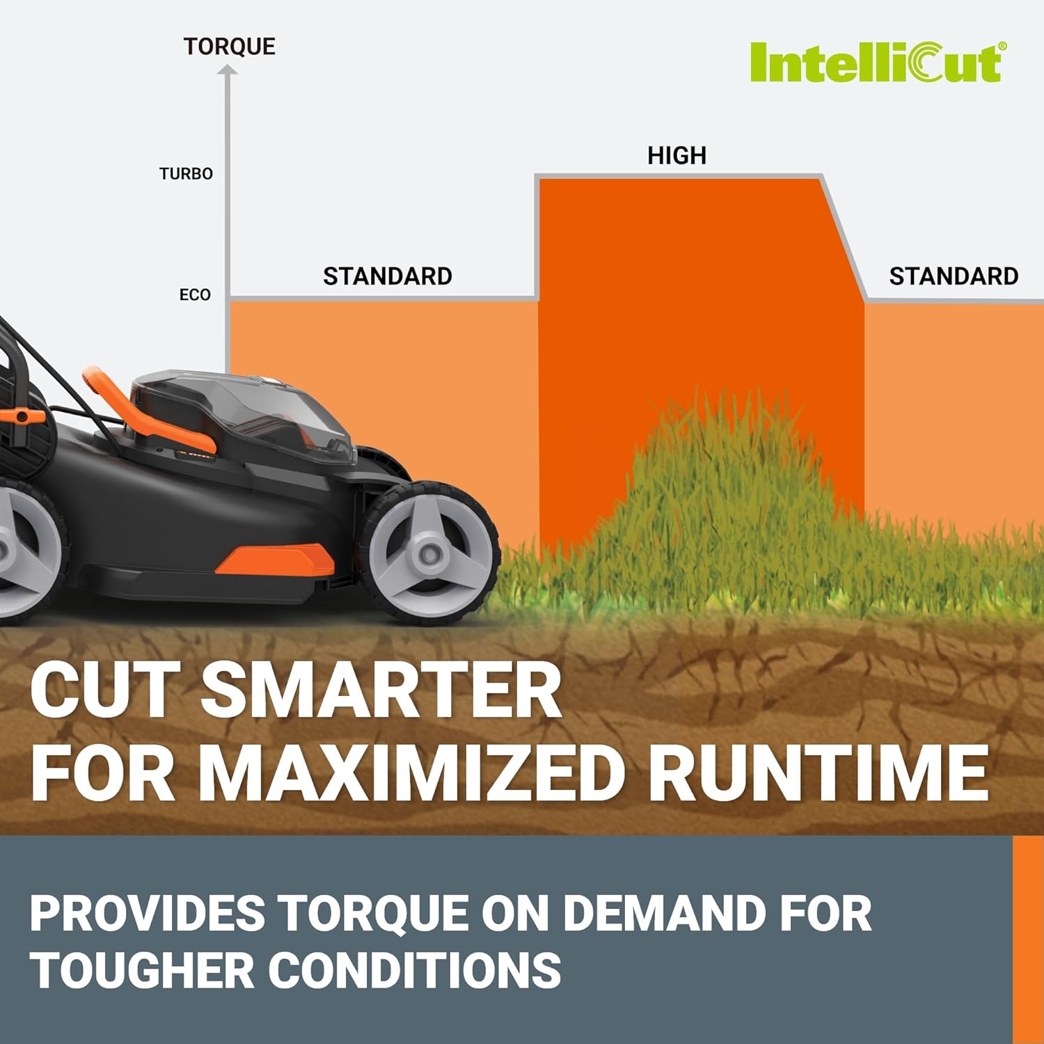 - INTELLICUT: Patented sensor technology automatically adjusts cutting speed to match the grass conditions. Intellicut increases cutting speed when it detects dense grass for smoother mowing, but slows down in less demanding turf to save on battery.