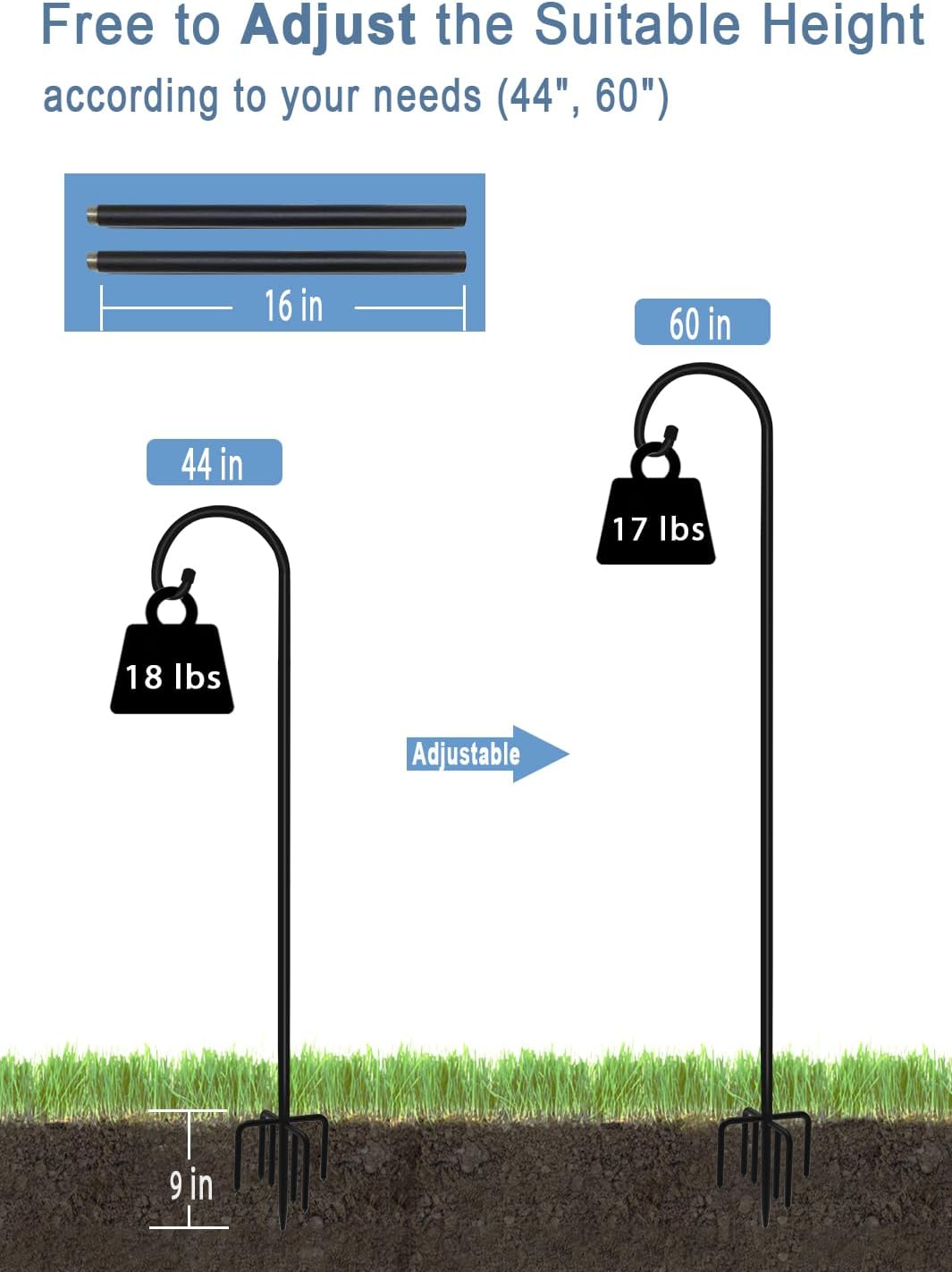 - Extendable & Tall Hook Hanger: The outside shepherd’s hook hanger made of 3/5 inch width & 2mm thickened steel pipe with 5 solid anchor points, you can free to adjust the suitable height for 60 " or 44 ", and also make it stands firmly in the ground without easily falling down, no fear of severe weather such as strong winds, heavy rains, and blizzards, (2 PACK / SET)
