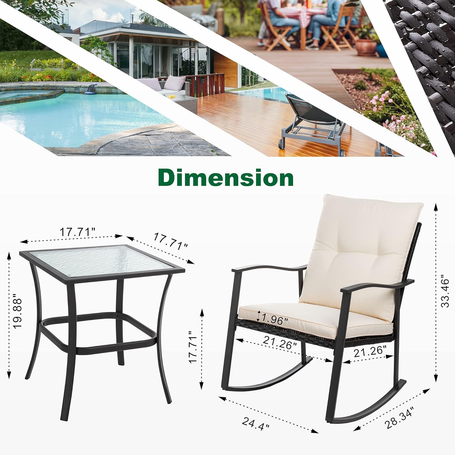 - Easy Cleaning And Maintain: 3 piece rocking bistro set included weather resistant wicker, and a coffee table with tempered glass, is easy to clean. Zippered cushion covers are made of superior fabric, fade resistant, water spill repellent and washable.