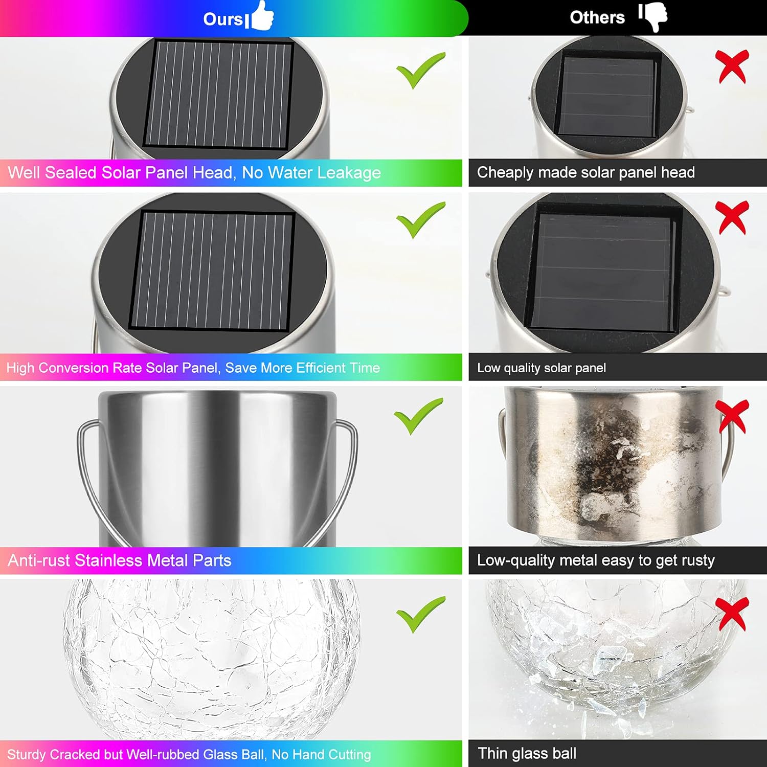 - 【Gorgeous Decoration Lighting & Great Gift】-With an eye-catching crackled glass ball cover, outdoor solar hanging lights will emit amazing glow and delivery comfortable illumination to your house, make your place look romantic and wonderful. Perfect decoration lighting for garden, patio, yard, fence, balcony, path, tree branch, umbrella, outdoor decoration party or daily life. Also an Ideal gift for your family and friends on anniversary, Birthday home warming, or other events and festivals.