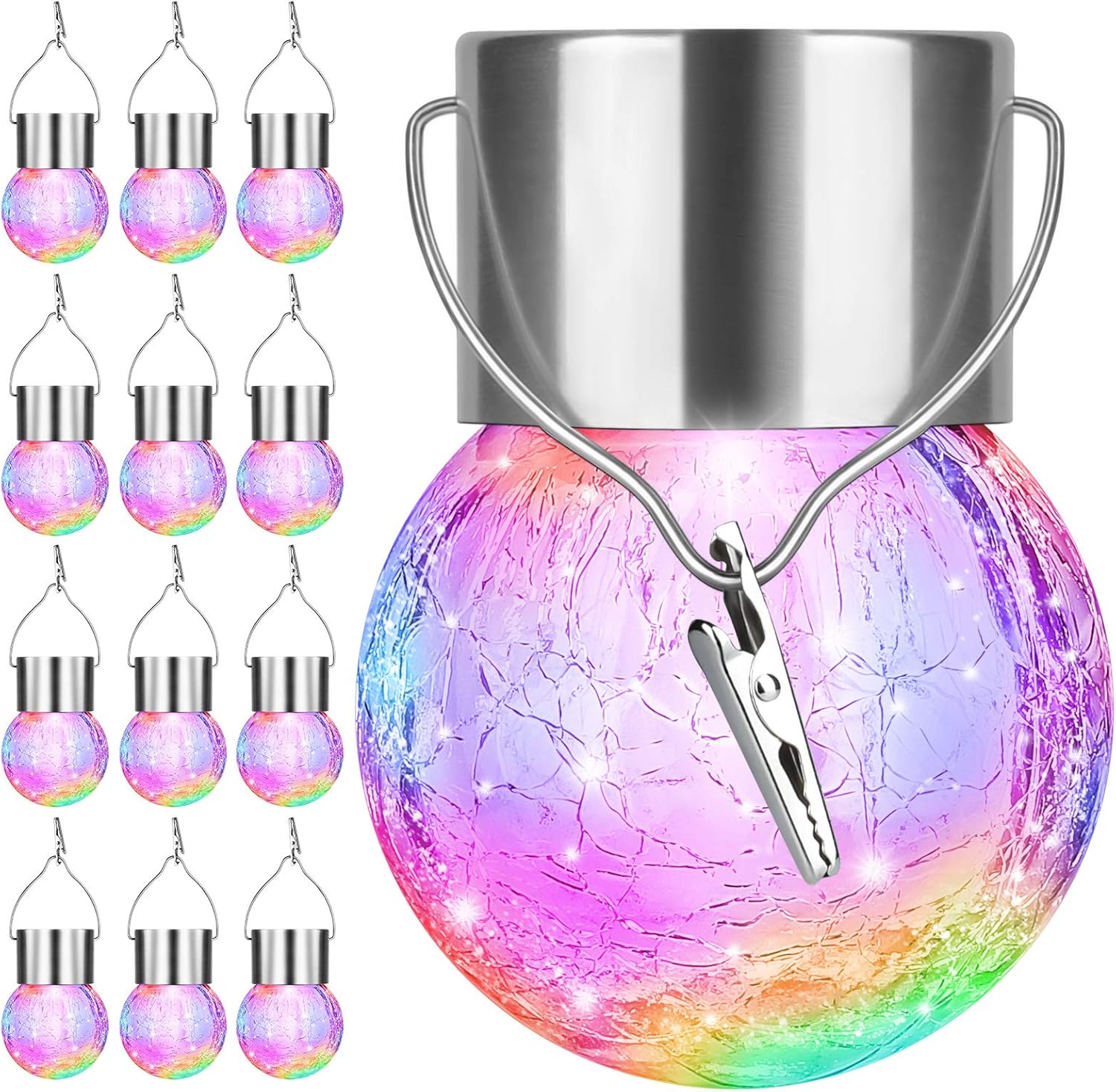 12Pack Outdoor Hanging Solar Lights - Cracked Glass Solar Lights Waterproof LED Decorative Ball Lights Tree Solar Powered Globe Lights with Hook for Garden Yard Fence Christmas Decoration, Multicolor
