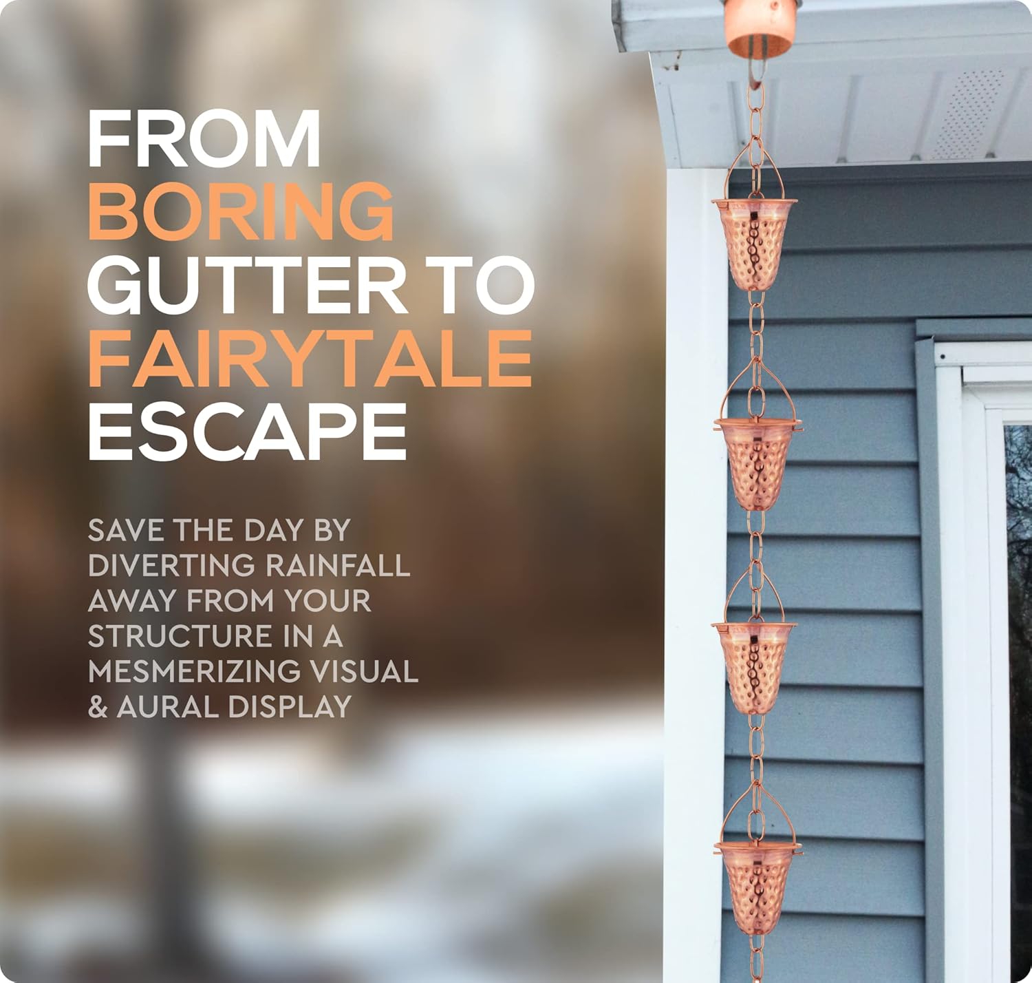 - ENCHANTING GARDEN RAIN CHAINS – Gorgeous Chimes & Cups Make a Beautiful Alternative to Ugly Downspouts – Hang From the Gutter & Watch the Water Collect & Direct Away from Your House in a Lovely Cascading Waterfall Display