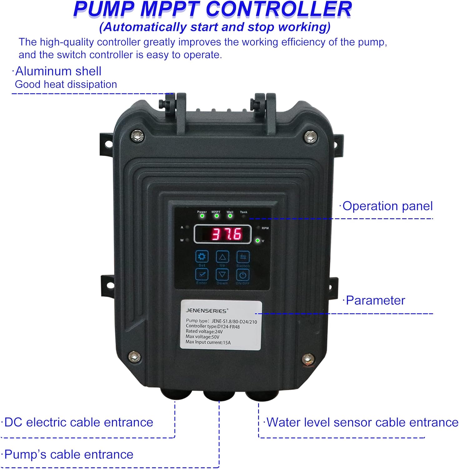 - [Specification]: JENENSERIES Solar Water Pump 24V DC,3 Inch Dia,9.8ft extension cable, Max head 262ft, 7.9GPM Flow, PV open circuit voltage 21-50V with MPPT controller for farm, Garden, home, pool, Industrial
