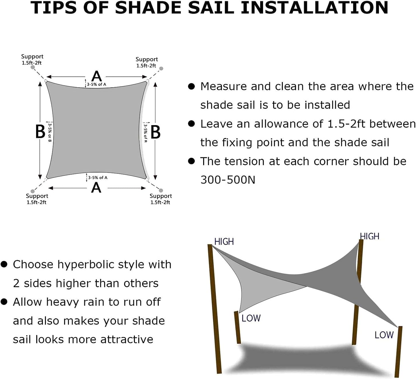 - Resistant Sun Sail: The shade sail protects your children, flowers, plants and cars safe from exposuring under the sun by blocking up to 95% UV rays. significantly reduce the temperature and UV sunlight in shaded area during summer time, ideal for patio, swimming pool, balcony, carport etc