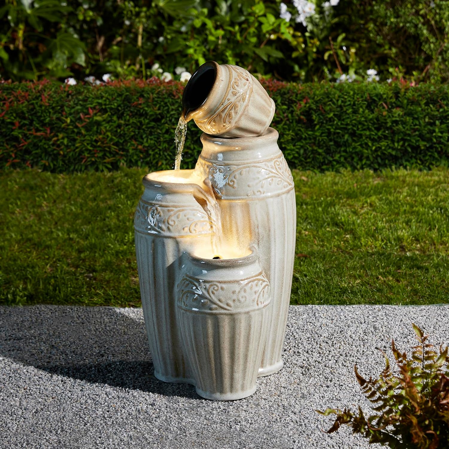 - Classic Design: Featured with Classical and timeless clay pots design with delicate embossed texture. There is warm white LED lights for the 2 lower pots, the trickling water rippled and sparkled in the warm. Elegant and charming kiln-fired sand beige glaze finish. With an antique look, the fountain brings a touch of natural beauty, the soft sound of cascading water is sure to make you relax and makes a soothing rest for you in the garden