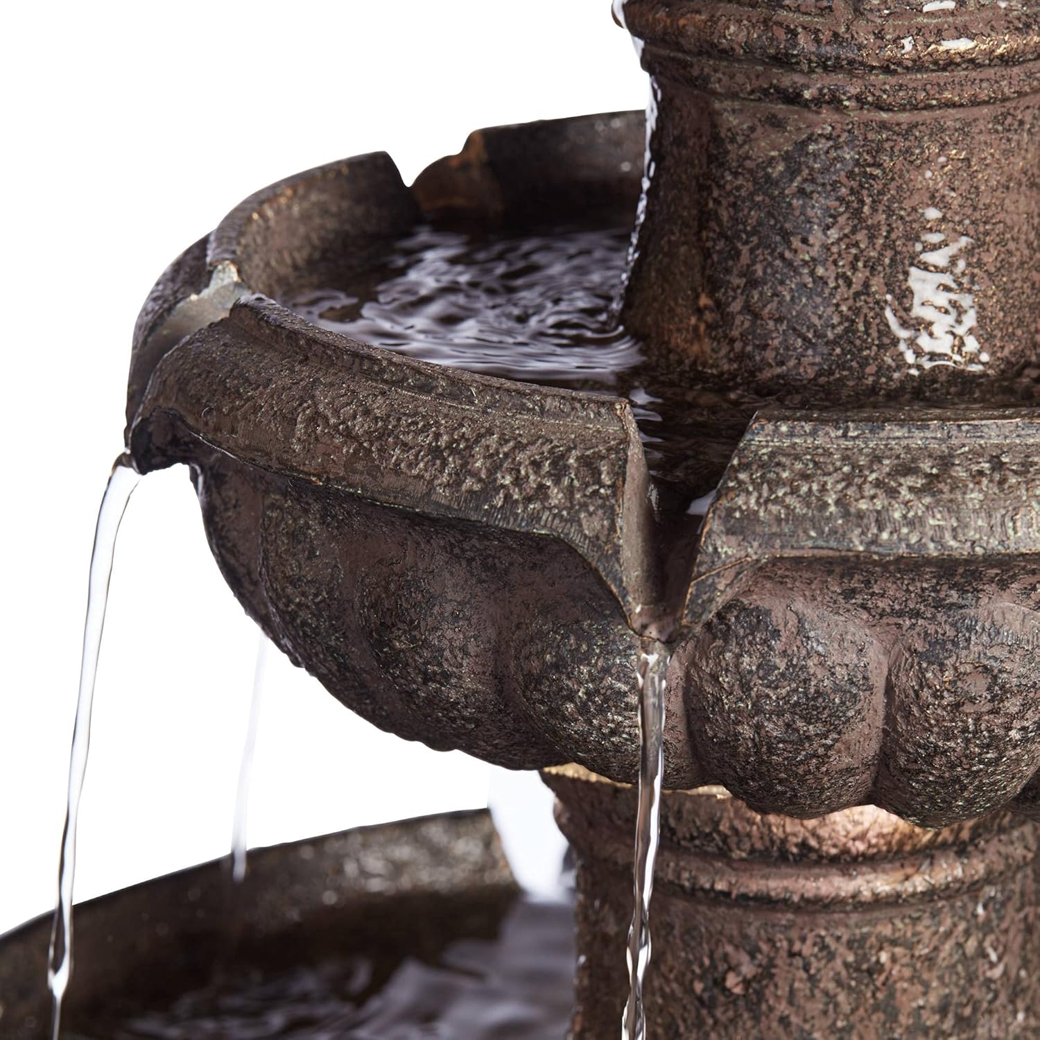 - 【Elegant charm for outdoor spaces】A courtyard fountain, floor fountain, or outside fountain brings timeless beauty to your front porch or backyard water feature, blending seamlessly with any patio waterfall or outdoor design. Lights shine down to illuminate the bottom two tiers. Flow of water from top into the lower tiers.