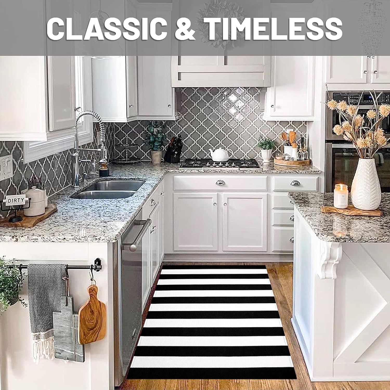 - Easy to Clean: This black and white striped rug is simple to maintain with machine wash or vacuuming to remove dirt. The rug is sturdy and can be tumble dried on low. Keep your door rug fresh and clean with minimal effort. NOTE: Cotton rugs normally shrink slightly after washing