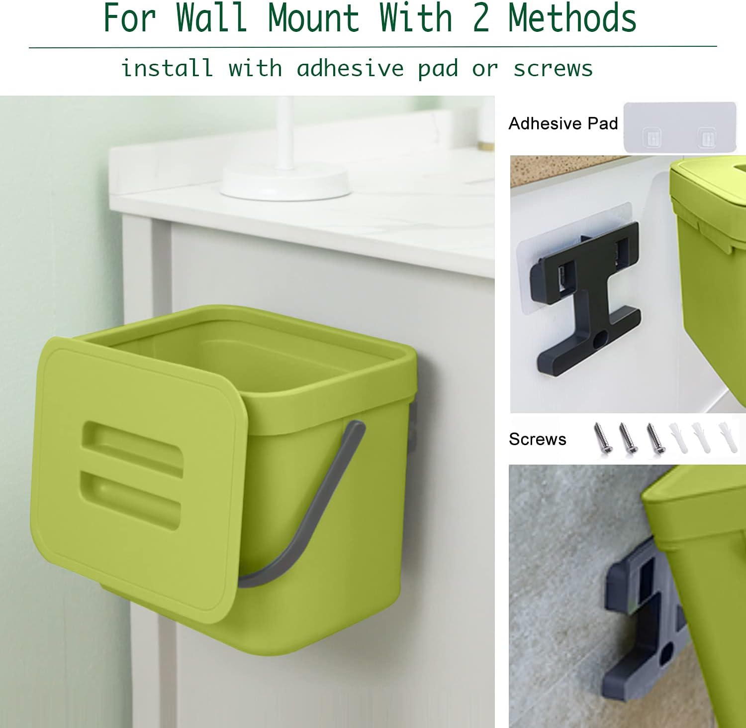 - 【Wall Mount/Under Sink/Countertop Trash Can】The small trash can could be easily hung on kitchen cabinet doors, pantry doors. (The thickness of the door should be less than 0.86 inch) Moreover, this food waste basket can also be wall-mounted to under sinks, cupboard, kitchen wall or bathroom wall with adhesive pad or screws.