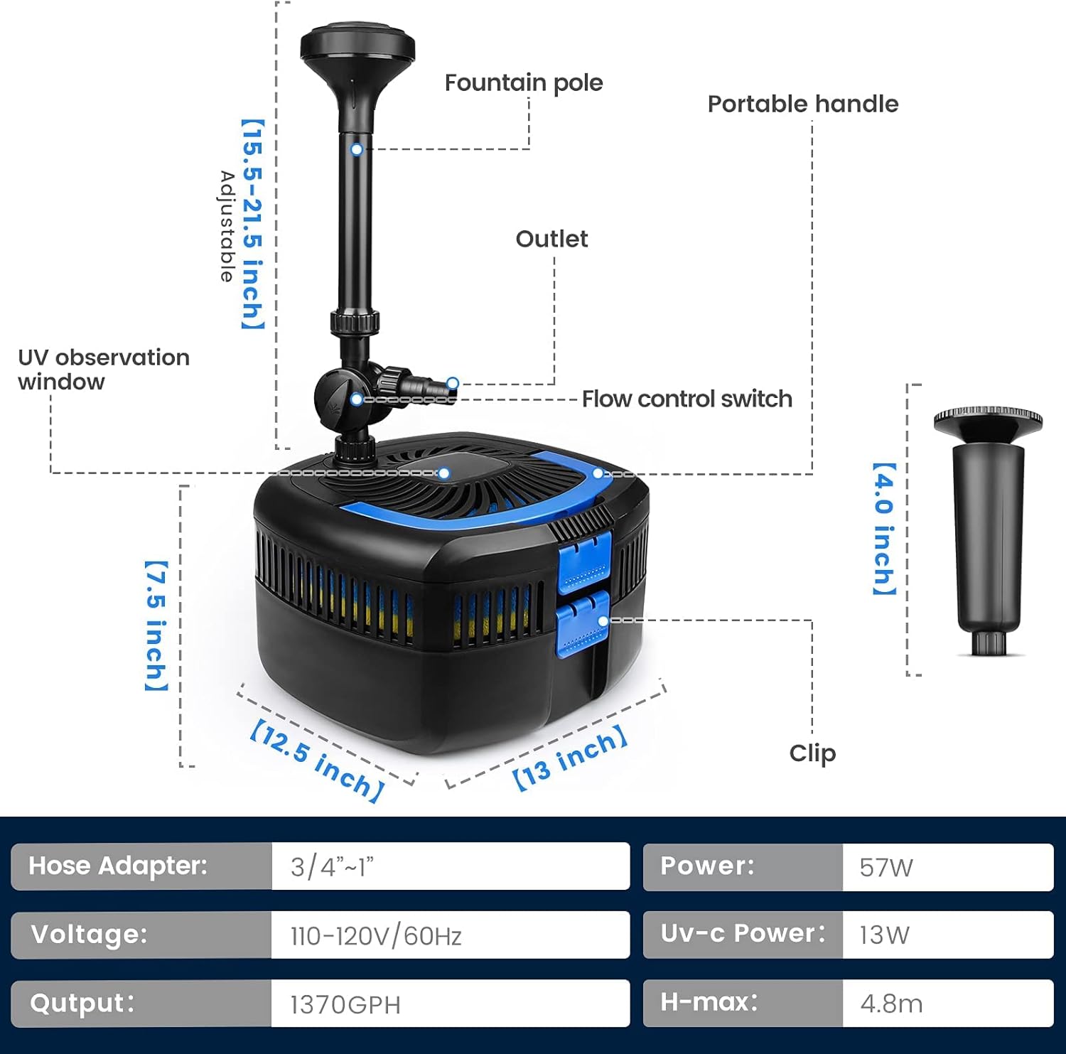 ANBULL 1370GPH Pond Filter Pump, 110V/57W All-in-one Fountain Kit, Variable Frequency Water Pump with 13W UV-C, High Efficiency Filter Water Pump for Outdoor Ponds up to 2113 Gallons