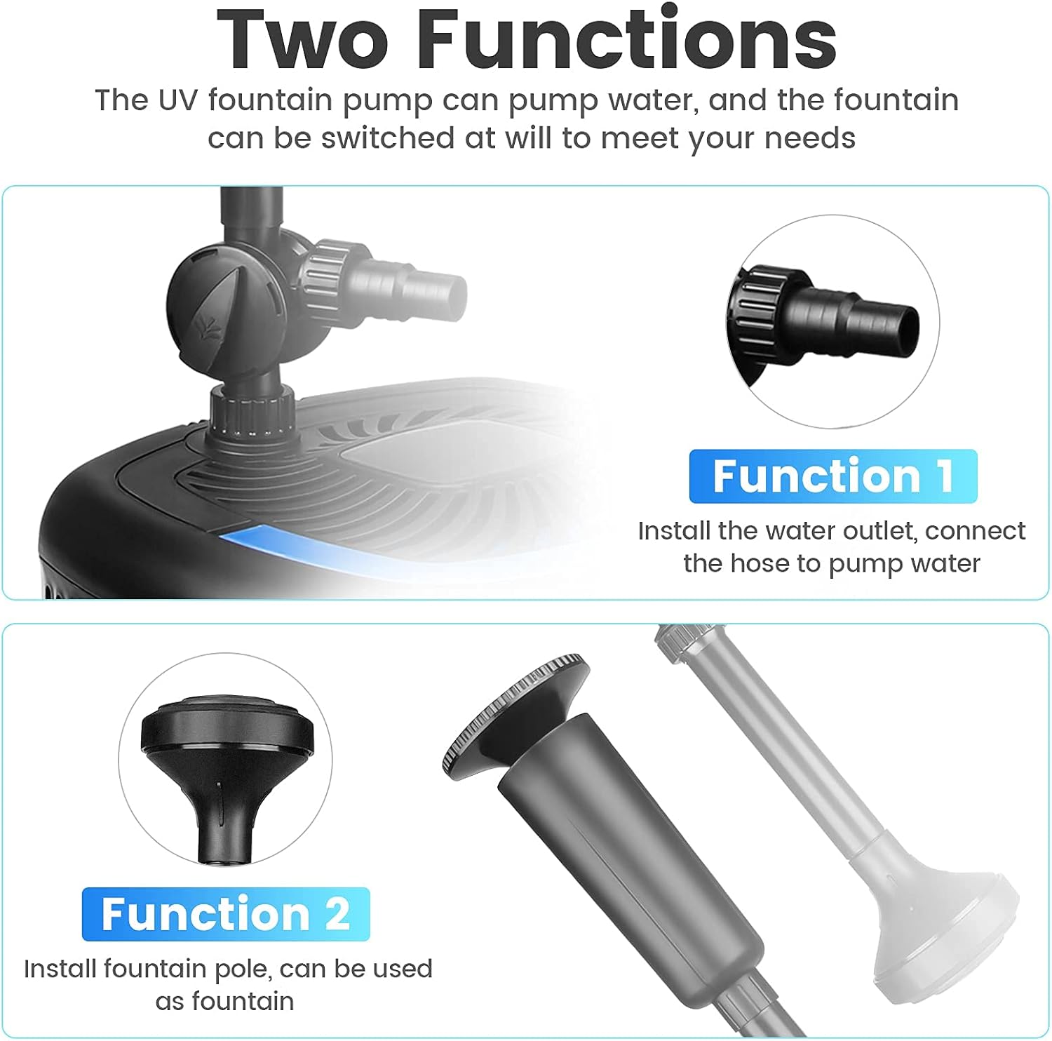 - 4 in 1 Multifunctional System: 1. Filtration: The pond pump can filter multiple times to purify the water quality. 2. Lamp: 13W work lamp effectively inhibit aquatic organisms and keep fish clean and healthy. 3. Pumping: The pumping flow can be adjusted to meet the daily pumping needs of the pond. 4. Fountain: Two fountain styles add charm to your pond.