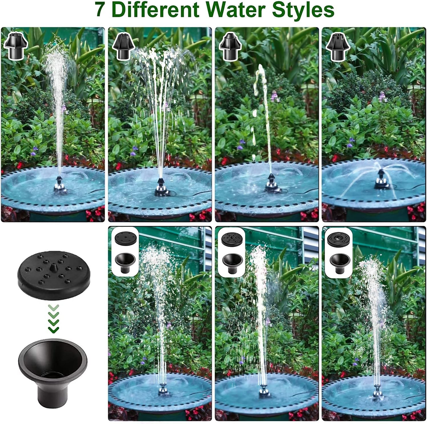 - Bird Bath Fountains with White LED Lights: Our bird bath fountain pump equipped with high-brightness White LED lights which make your garden more beautiful and vibrant during the day and night; And with 7 nozzles, there are 7 different water style, you can easily disassemble and replace and choose the water style you like