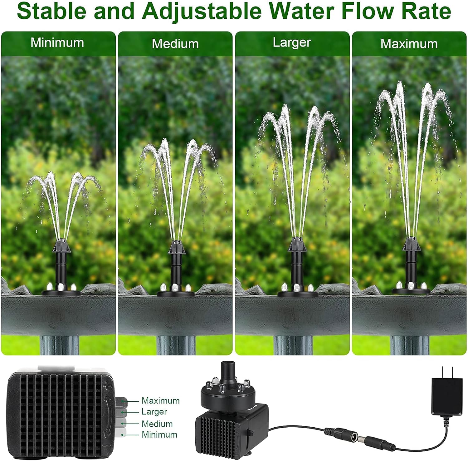 - 24-hour Working Fountain Pump: Different from traditional solar fountains, solar fountains may not work under the shadow, this fountain can work 24 hours a day, no matter what seasons or weather, just plug it into work; Come with 16.4 Ft Power Cord, you could place the electric bird bath fountain pump in the garden far away