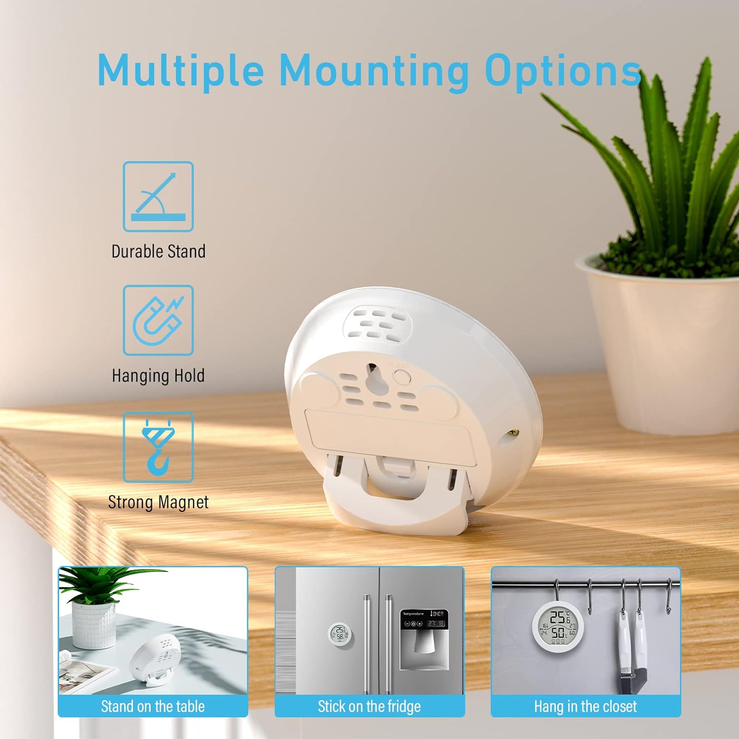 - [3 Ways to Install] Our digital humidity monitor may be mounted on a wall using a single nail, attached to the refrigerator using the built-in magnet or used on any flat surface using the stand.