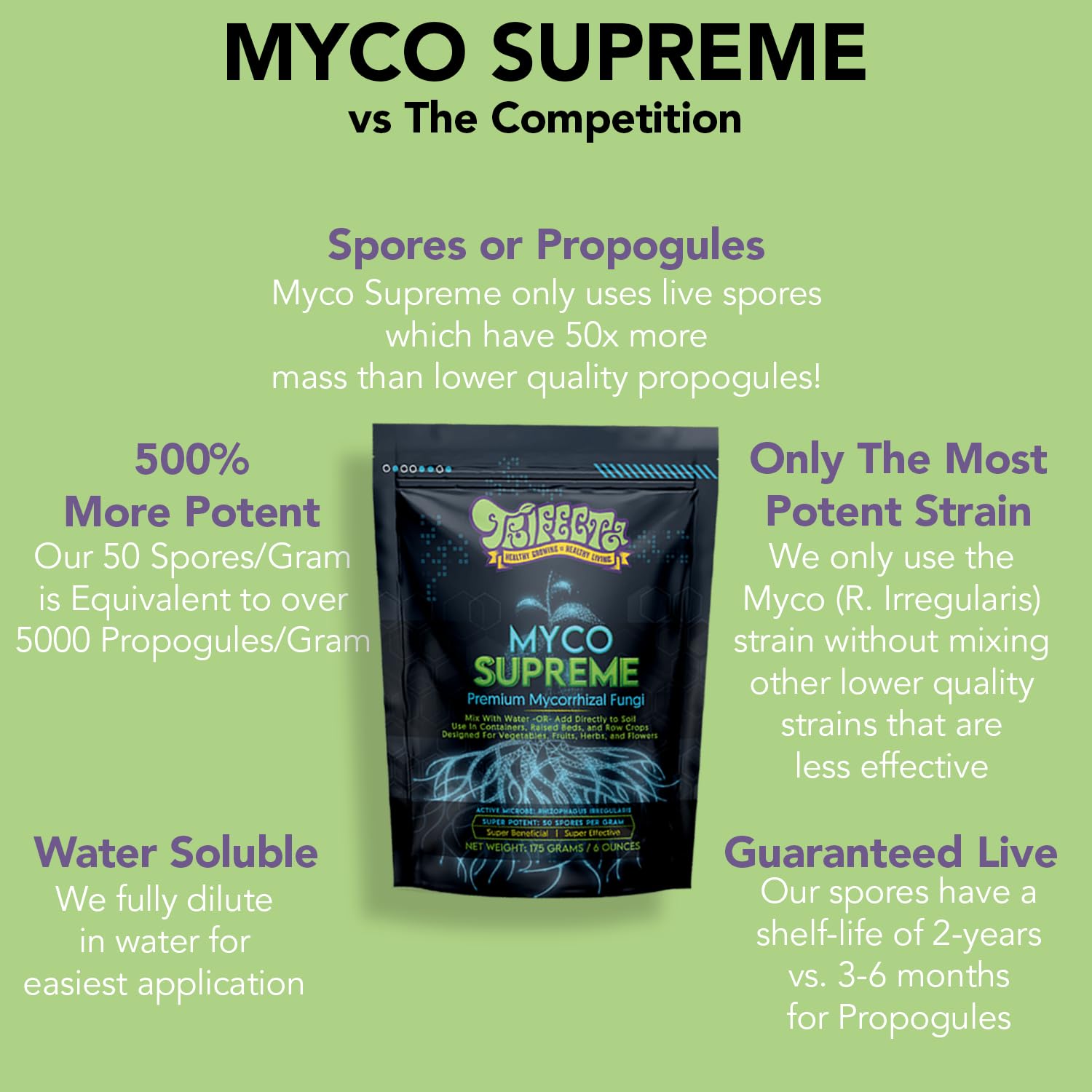 - STRONGEST ULTRA CONCENTRATED FORMULA. We give you the best results with our super potent Mycorrhizal Inoculant that's equal to 5,000 propagules per gram and 141,000 propagules per ounce. Trifecta Myco Supreme Endomycorrhizae Powder outperforms the competition with over 500% more potency than most other products on the market which means bigger yields for you. Our all natural & organic patented 50 spores per gram are bio-encapsulated to arrive alive and fresh, guaranteed.