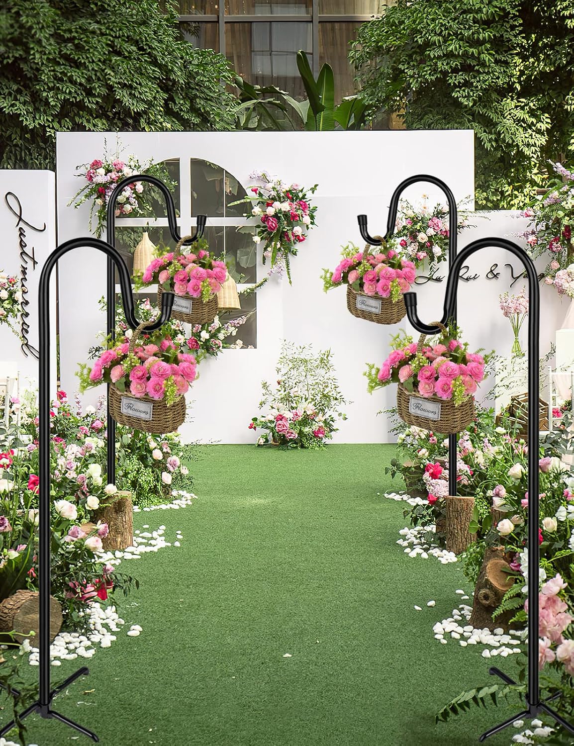 - 【Wide Application】Our metal adjustable hangers are widely used for outdoor wedding aisle and ideal for hanging flower pots, solar lights, lanterns, flower jars, candle holders, garden lights, mason jars, string lights, wind chimes, ornaments, flower balls, birdbaths, shooting targets, plant baskets, and also a decorative freestanding for hanging holiday wedding outdoor decors, coconut coco-fiber moss baskets, hummingbird feeders and other accessories!