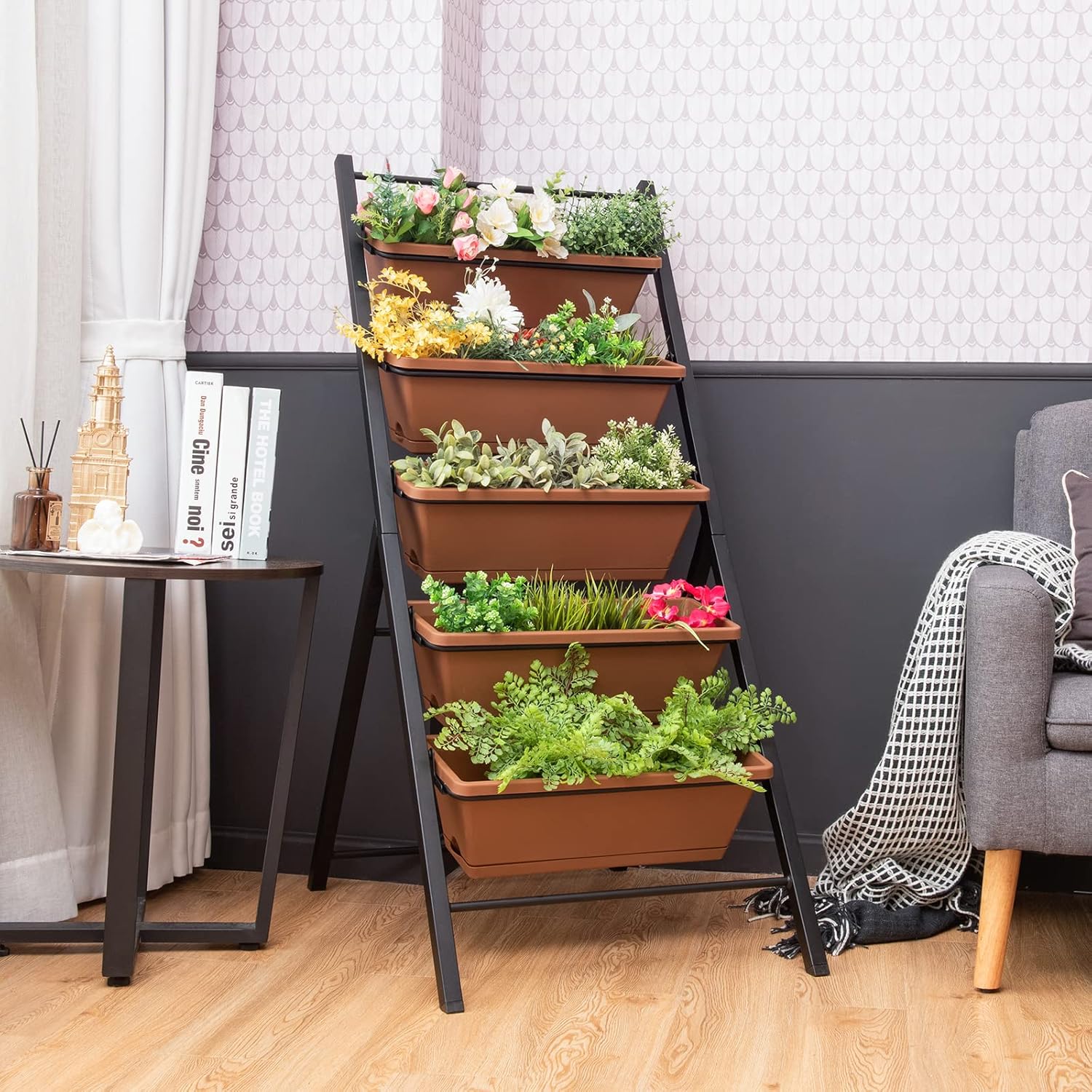 - 『5 Plant Container Box』: This 5-tier vertical garden is equipped with 5 PP made container boxes, which are durable for long-term use in both outdoor and indoor environment. Each box can hold 0.5 cubic feet volume of soil and its weight should no more than 22lbs. Your plants could have a warm home and grow healthily.