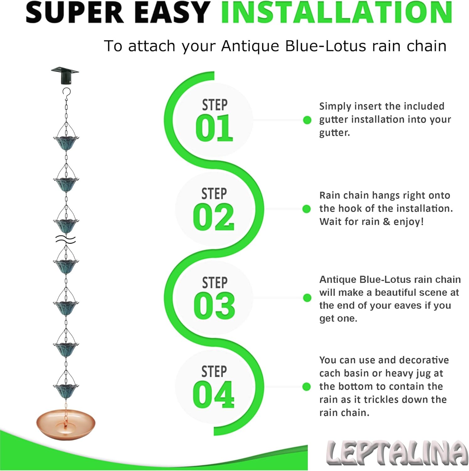 - Featuring 12 beautifully ornate lotus cups, our rain chain adds a chic touch to your roof, awning, or shed. Moreover, the rain chains are painted in an antique blue color, to perfectly complement your roof and garden decor.