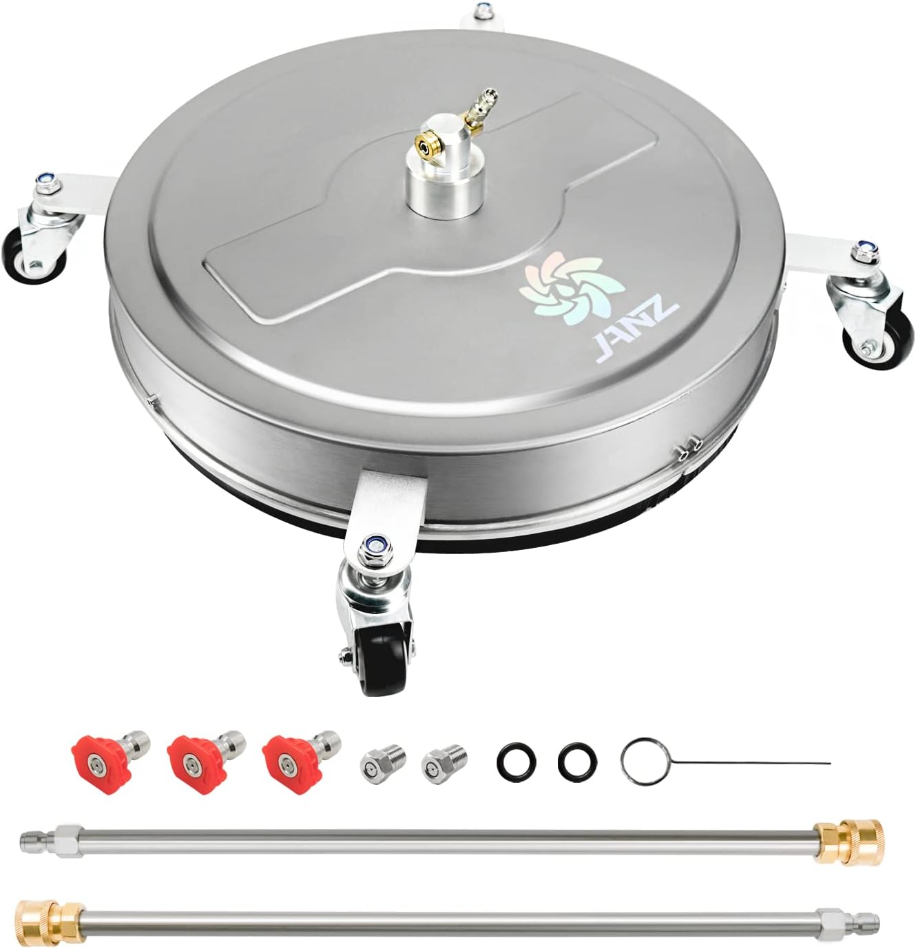 JANZ 20'' Pressure Washer Surface Cleaner with 4 Wheels, Stainless Steel Housing, 1/4" Quick Plug, 2 Extension Wands, 2 Replacement Nozzles and 3 Spray Nozzles, 4000 PSI