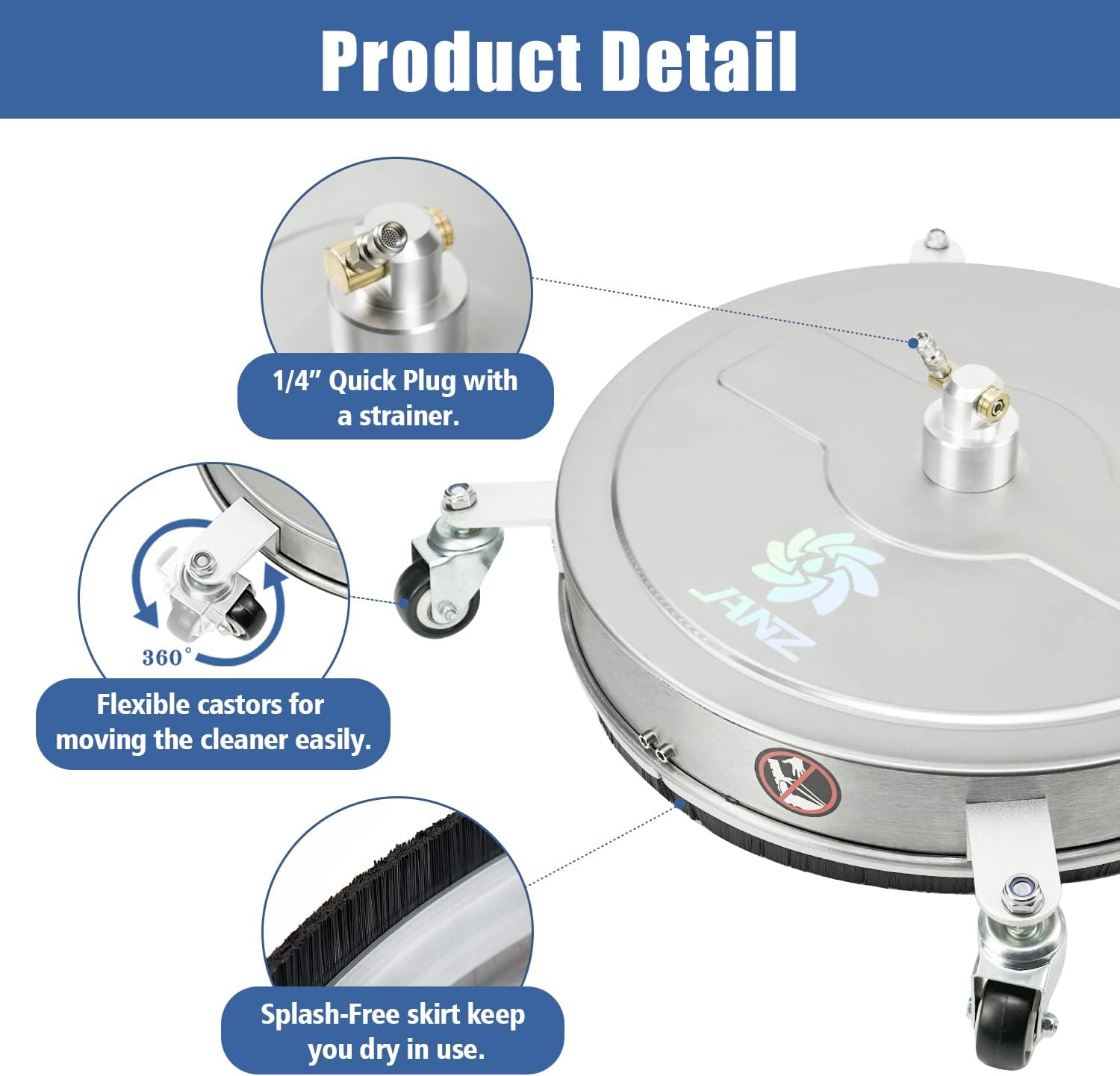 - PROFESSIONAL CLEANING - The JANZ surface cleaner offers commercial-grade cleaning within an area 20" wide, featuring two spinning nozzles rather than one and guaranteeing exceptional cleaning performance. It is extremely appropriate for removing stubborn stains on extensive surfaces such as driveways, patios, decks, sidewalks, and numerous others.