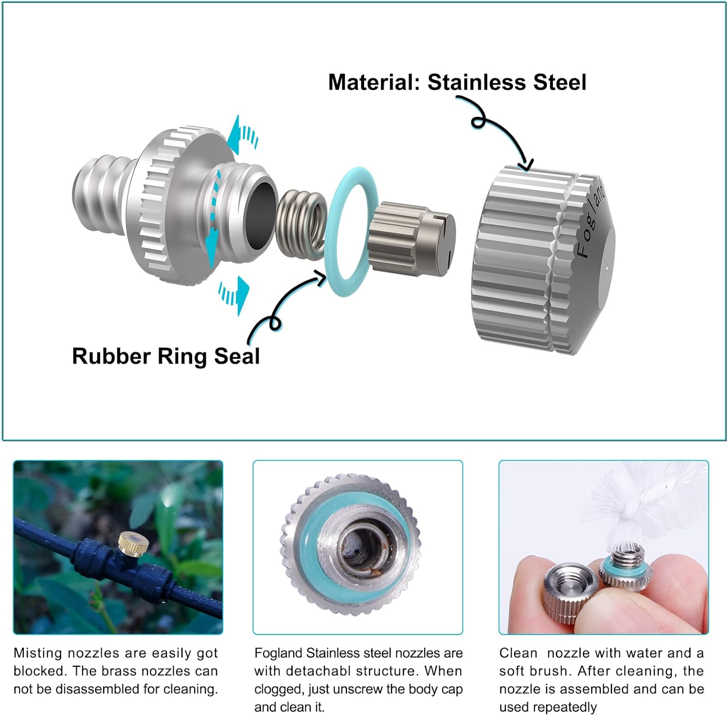 - [Anti-clogging]: Fogland misting nozzle adopts a detachable body design and has an anti-clogging function. When the mist nozzles is blocked and the flow is small or the spray performance is poor, just disassemble the nozzle and clean it under running water with a soft brush. The cleanable and reusable nozzle will save you money!