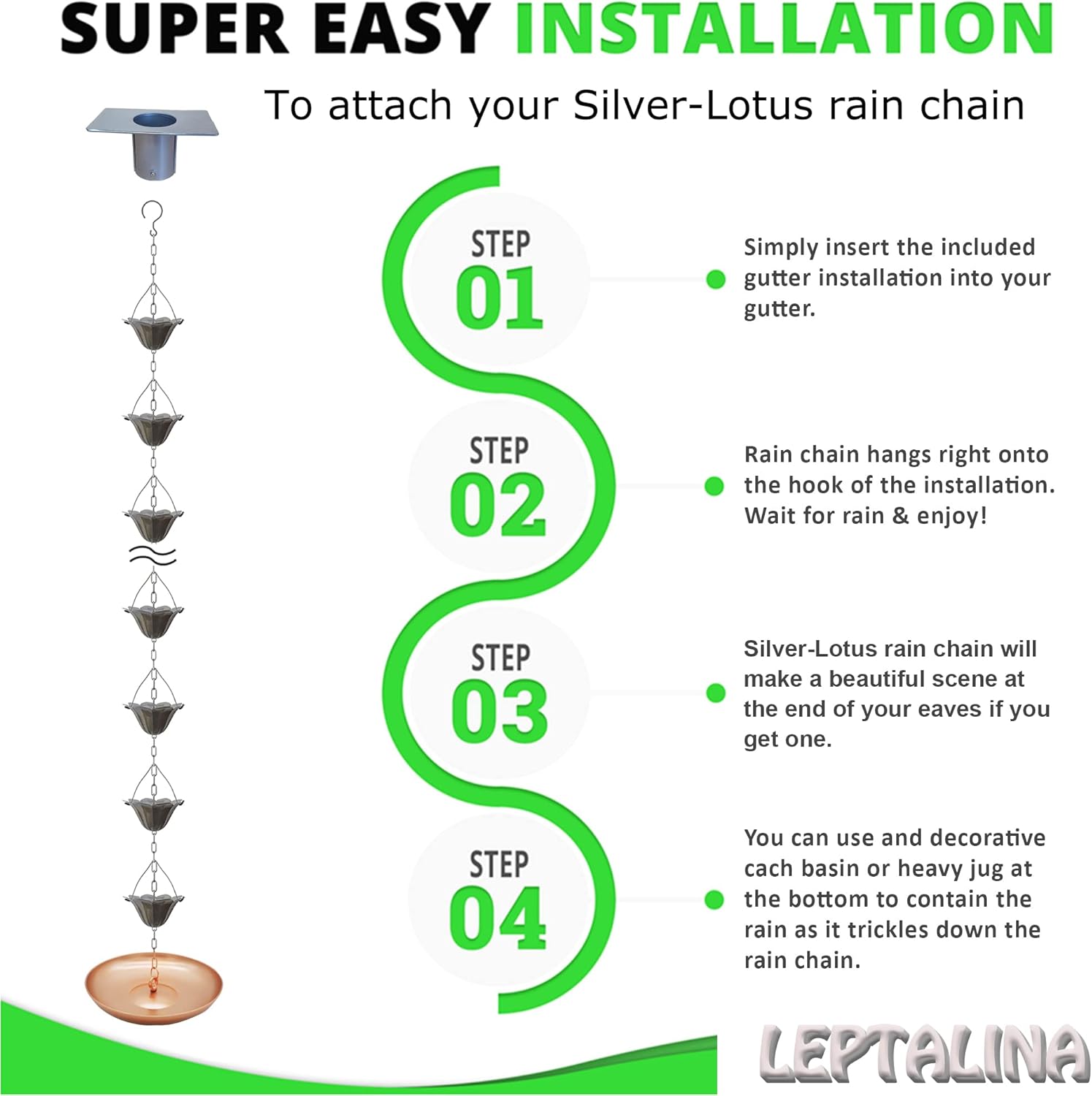 - Featuring 12 beautifully ornate lotus cups, our rain chain adds a chic touch to your roof, awning, or shed. Moreover, the rain chains are painted in a silver color, to perfectly complement your roof and garden decor.
