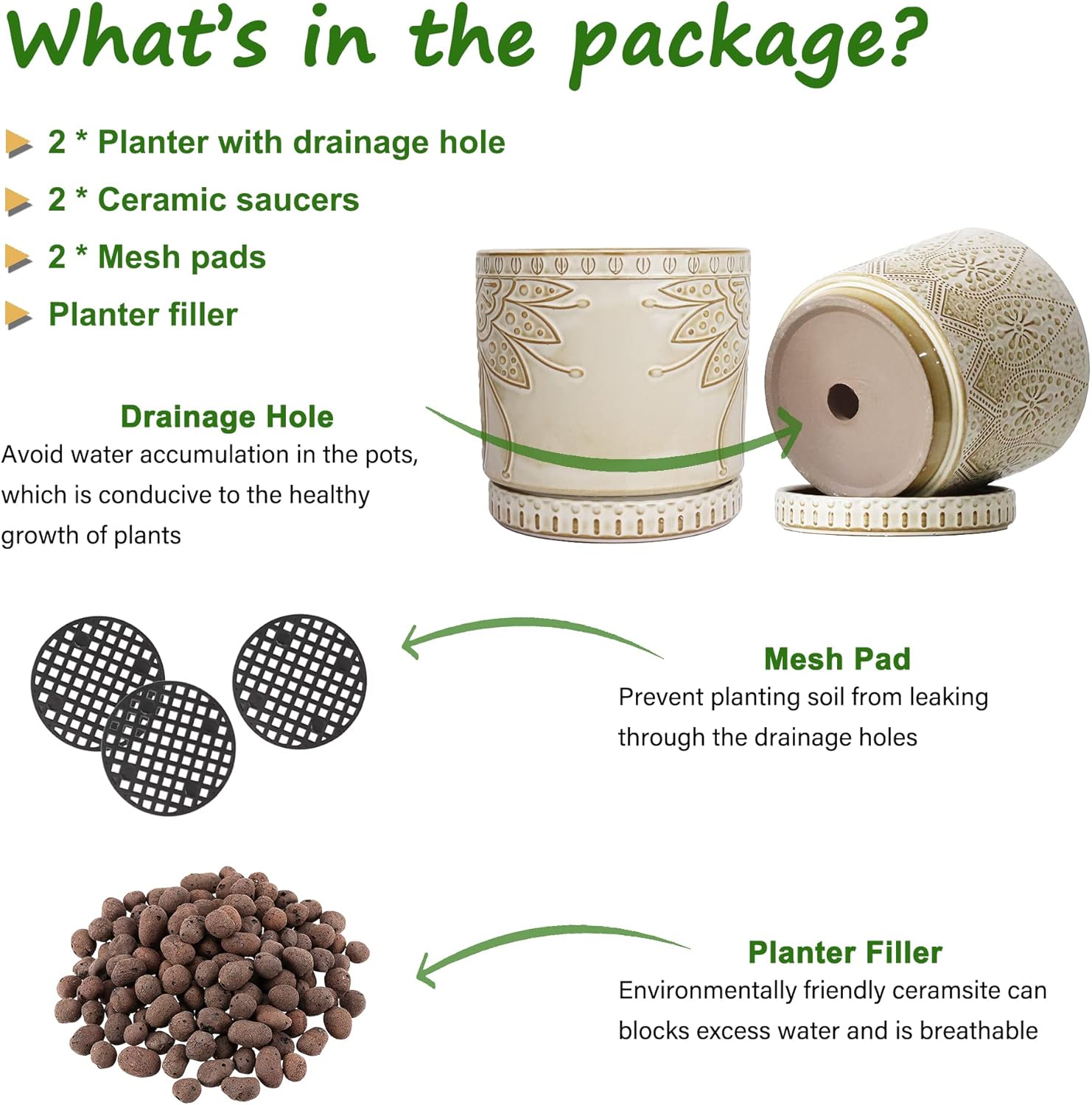 - Size & Package : 6 Inches set of 2. Package: contains 2 ceramic flower pots, 2 ceramic saucers and 2 mesh pads(NOT INCLUDE PLANTS)