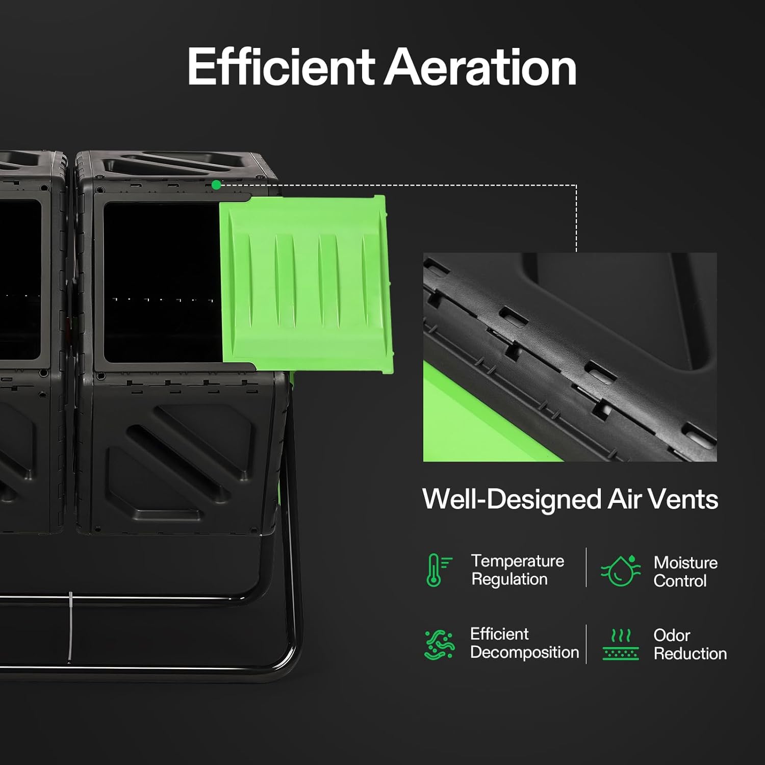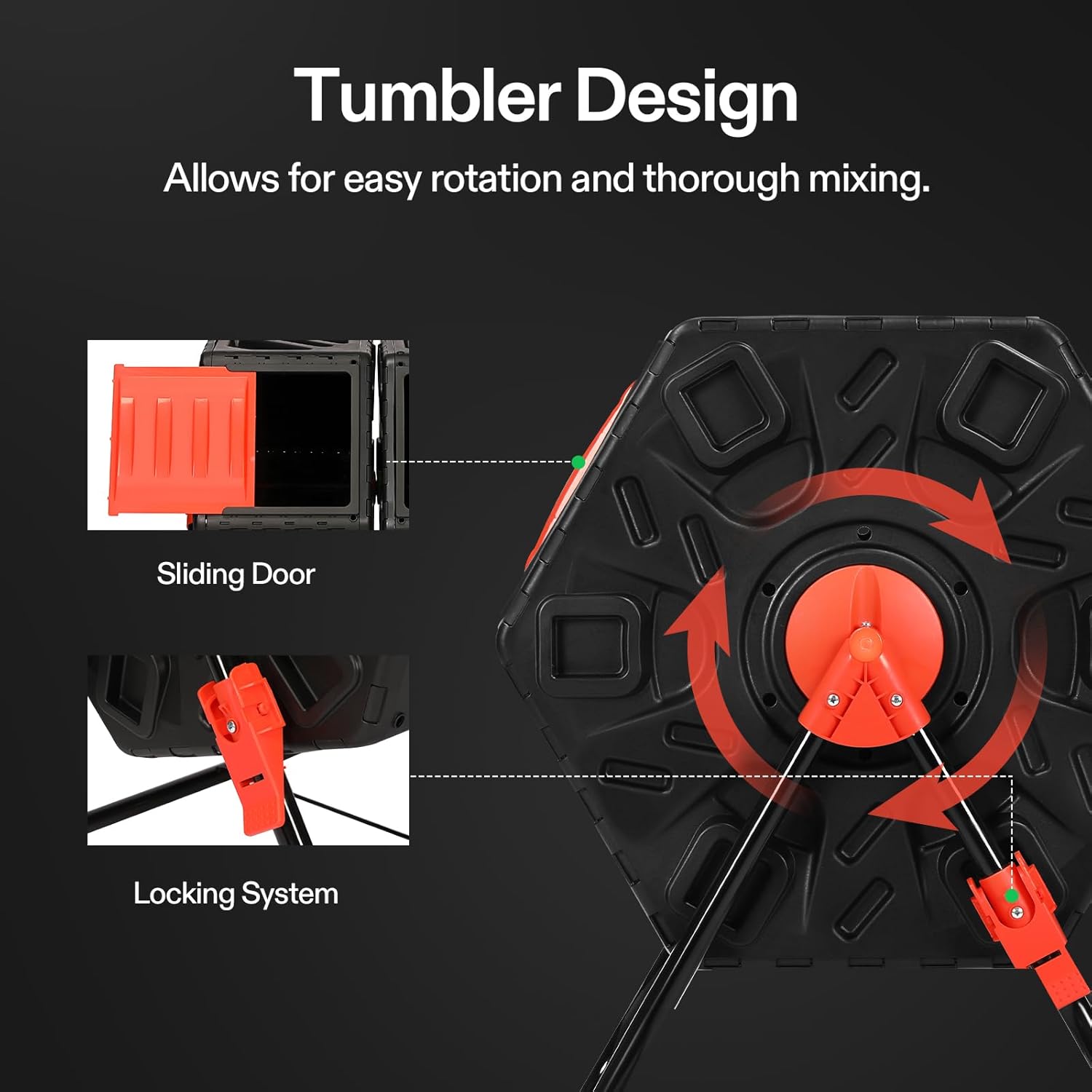 - Efficient Aeration: The well-designed air vents and deep fins accelerate air circulation by breaking up clumps inside the chamber and mixing oxygen throughout the compost; The removable door is large and separated, making it convenient to add your waste or remove the finished compost; Also comes with a lock braking system for stable use