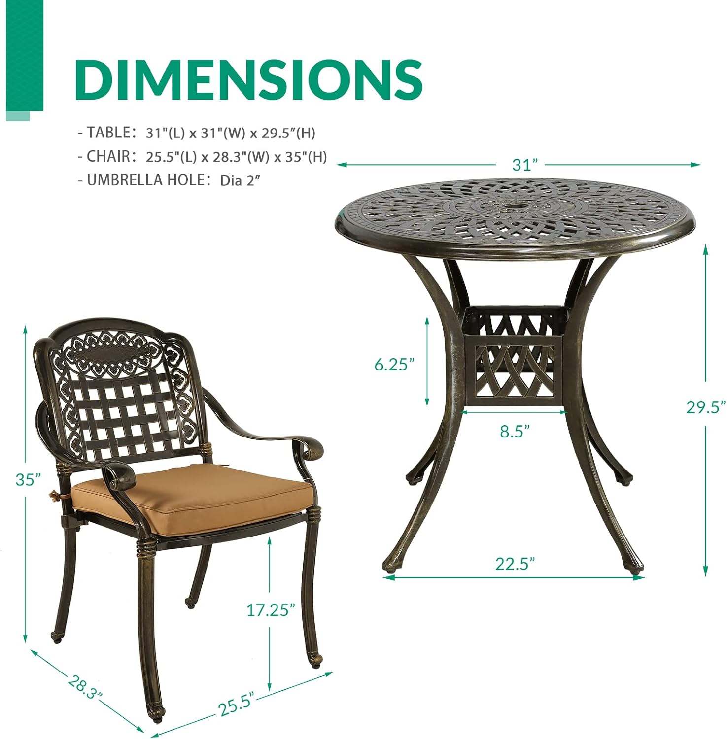 - 【STYLISH APPEARANCE】 - This 3-Piece Dining Set includes 2 stylish and comfortable chairs and 31" round cast table. Elegant cast accents scroll across the chairs and table top, adding a level of sophistication and craftsmanship to the collection. Perfect addition to your patio, yard, deck, or porch.