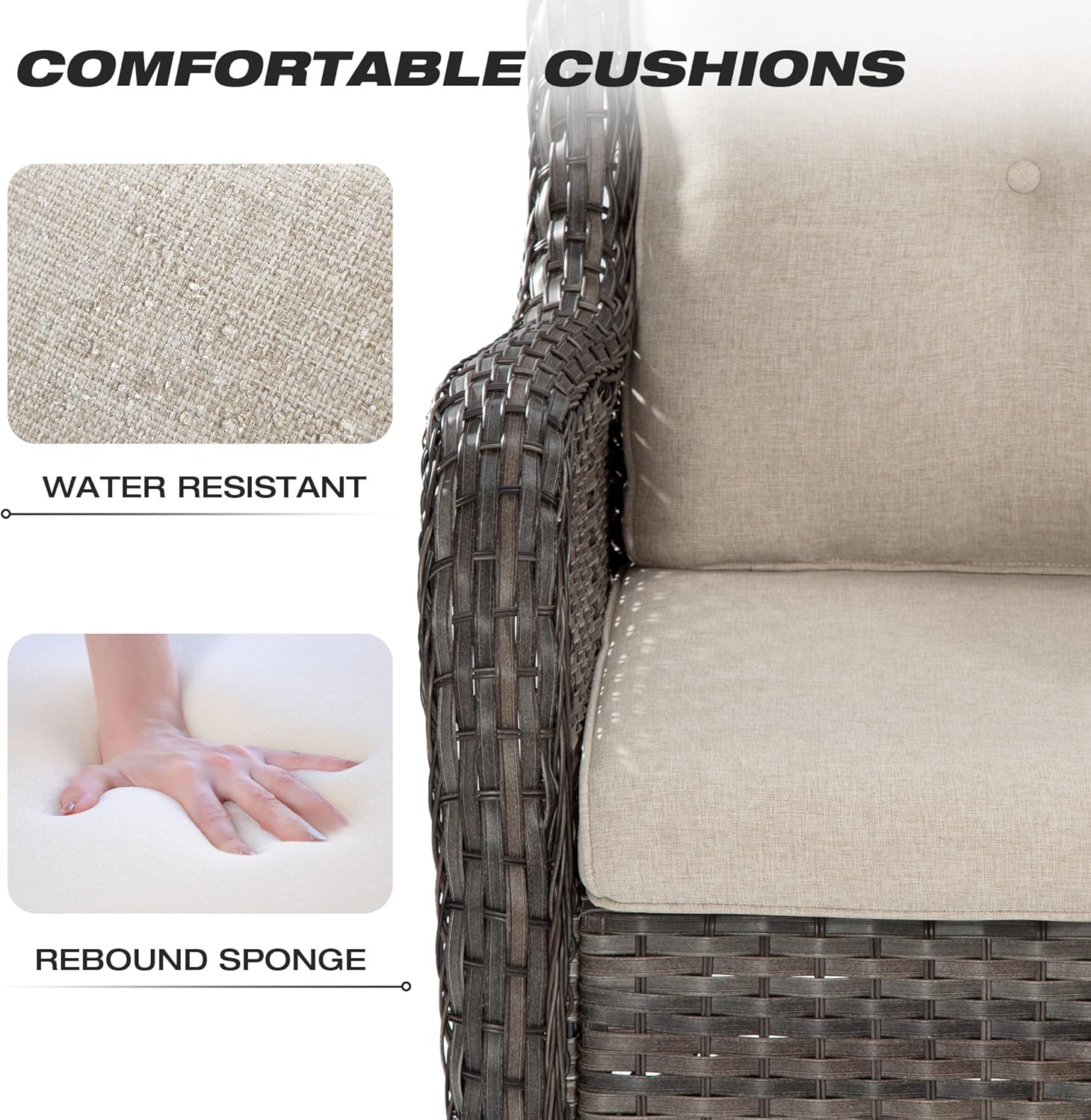 - Ergonomic Structure: This wicker swivel patio chairs have comfortable streamlined seats, ergonomically designed backrests and widened armrests which can provide the utmost comfort. The thick and soft back & seat cushions make you feel more comfortable to sit on and enjoy your patio leisure time