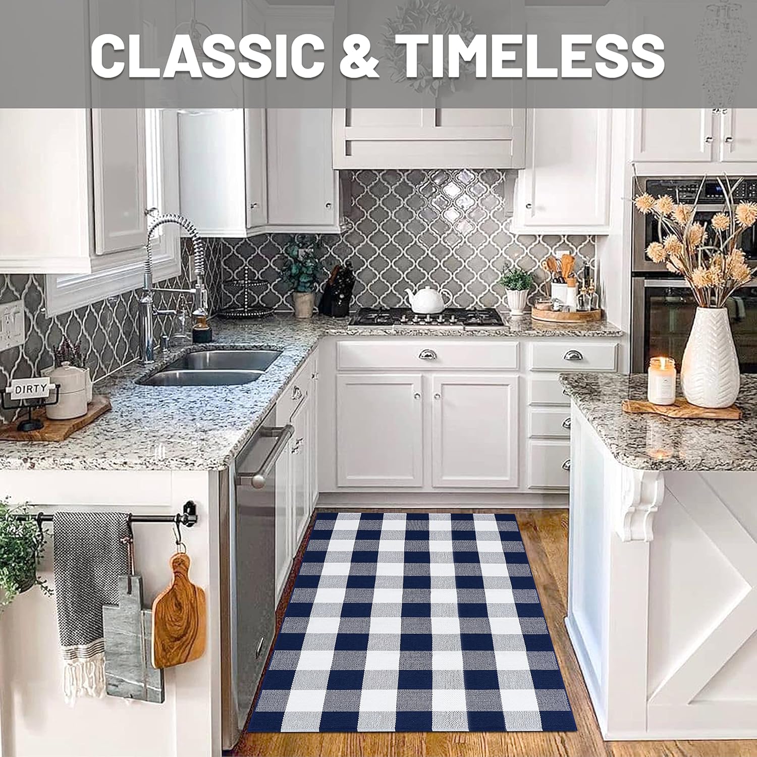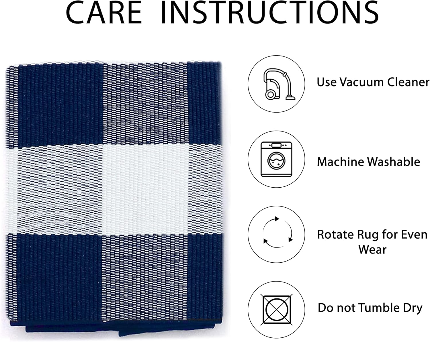 - Easy to Clean: This navy and white checkered rug is simple to maintain with machine wash or vacuuming to remove dirt. The rug is sturdy and can be tumble dried on low. Keep your door rug fresh and clean with minimal effort. NOTE: Cotton rugs normally shrink slightly after washing
