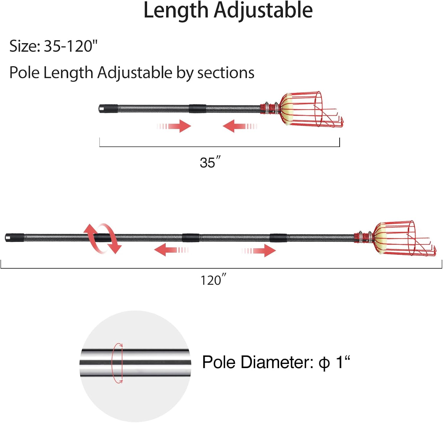 - ▼【Length Adjustable】Cherry picker tool length is adjustable by sections to be 35" to 120" which is safer and more efficient to get fruit from tall trees without falling off a ladder any more.