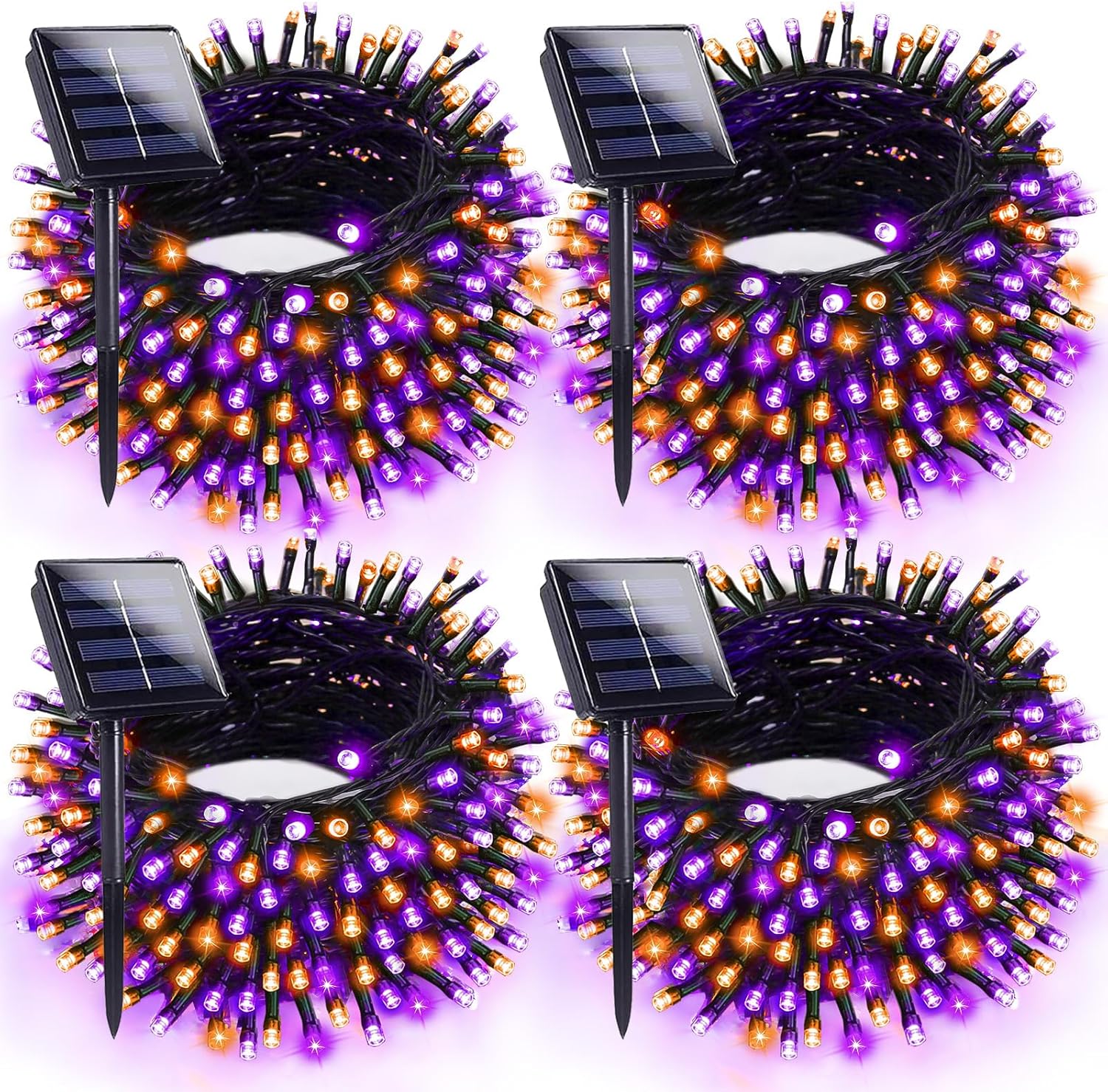 4pk Orange and Purple Solar Halloween Lights Outdoor Waterproof, 400LED 132FT Solar Powered LED String Lights Black Wire with 8 Modes, Solar Fairy Lights for Halloween Horror Party Tree Wedding Decor