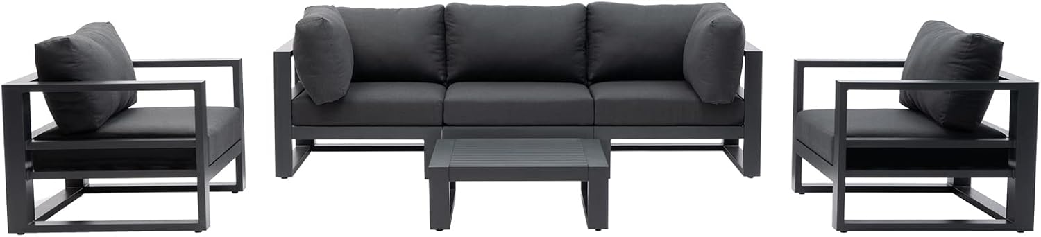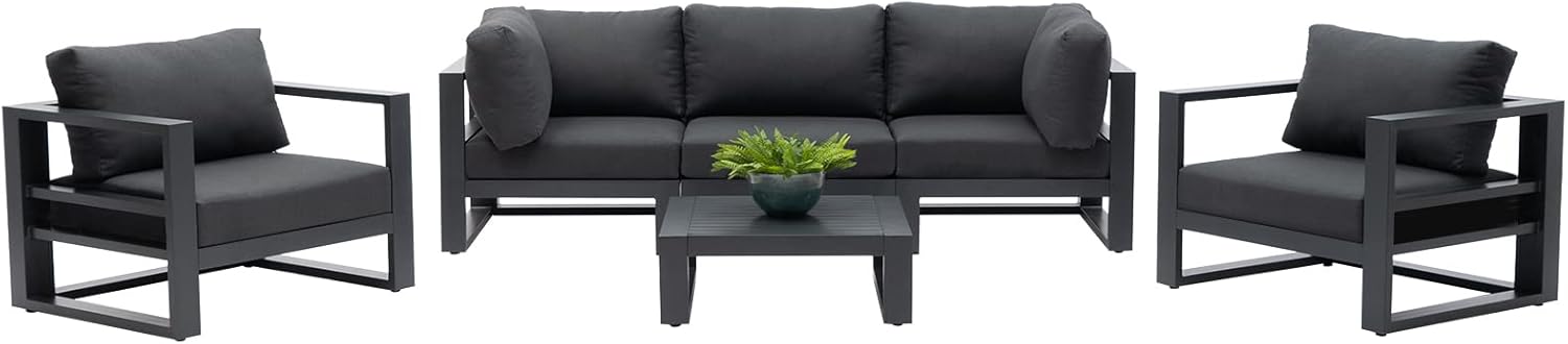 - HIGH-GRADE ALUMINUM FRAME: Made from extruded powder-coated aluminum tubing, the sturdy frames provide optimum durability and weather resistance for outdoor use. This aluminum conversation set is much lighter than the metal conversation set but not so light to be blown away in windy days. One person can easily lift a single sofa up and two persons can move the set around effortlessly. This aluminum conversation set is also easy to recycle at the end of its lifespan.