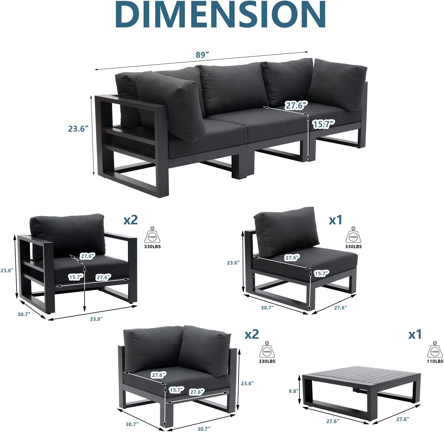 - OVERALL DIMENSION(FULLY ASSEMBLED): Single Armrest Sofa Dimension: 33.9"W x 30.7"D x 23.6"H. Single Armless Sofa Dimension: 27.6"W x 30.7"D x 23.6"H. Single Corner Sofa Dimension: 30.7"W x 30.7"D x 23.6"H. Square Coffee Table Dimension: 27.6"D x 27.6"W x 9.8"H. Each single sofa can support up to 330 pounds and this set is designed to seat five people. Featuring clean lines and timeless silhouettes, this set is an ideal set to perfectly fulfill your needs for outdoor leisure and entertainment.