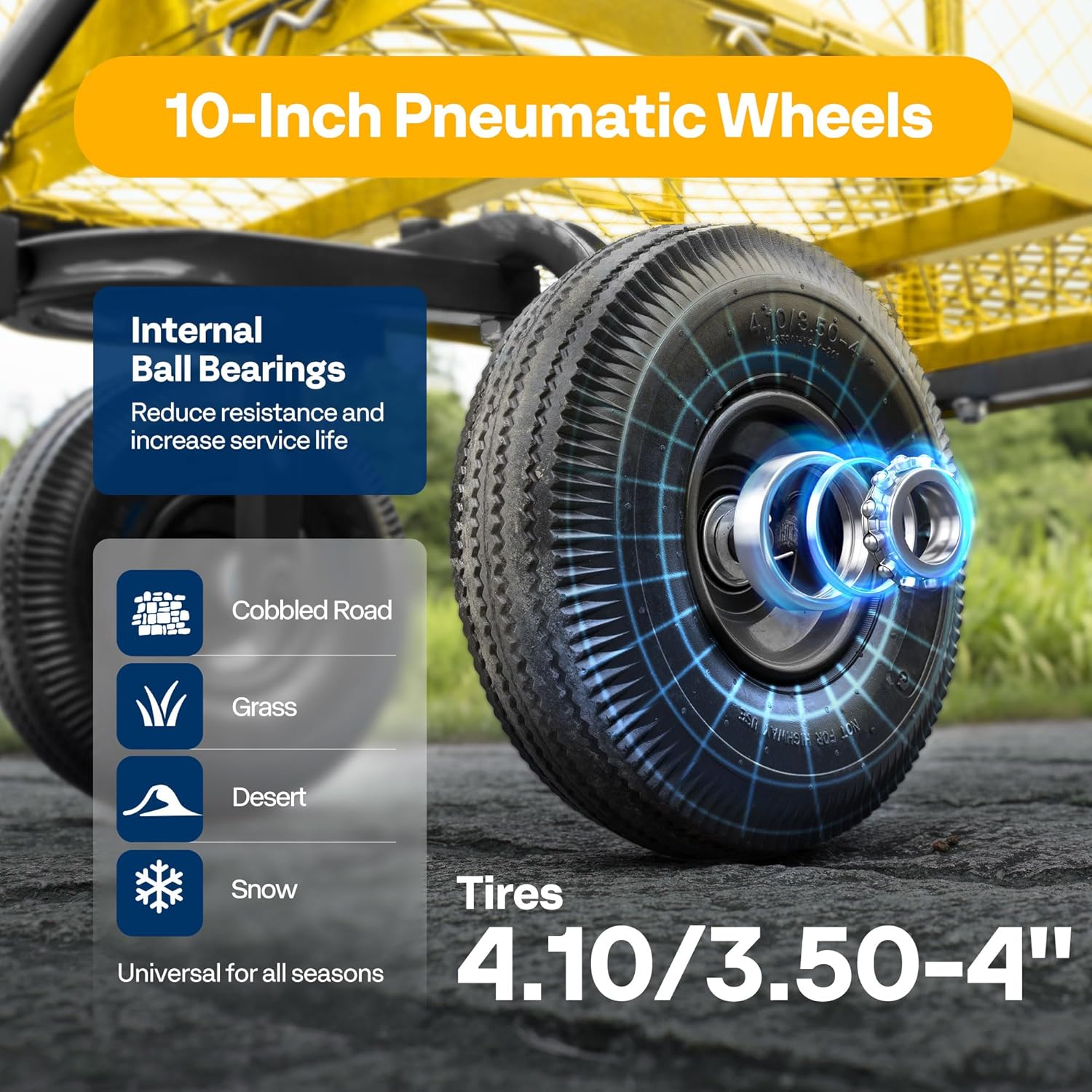 - NOISE REDUCTION TIRES - The load-bearing, shock-absorption, and noise- reduction of the cart are all determined by the casters; The pneumatic tires have good elasticity, impact resistance, and noise reduction; Compared with small wheels, large wheels are able to adapt to various road conditions and have good load carrying advantages; PLEASE BE AWARE that the tires are not fully inflated due to safe transport consideration