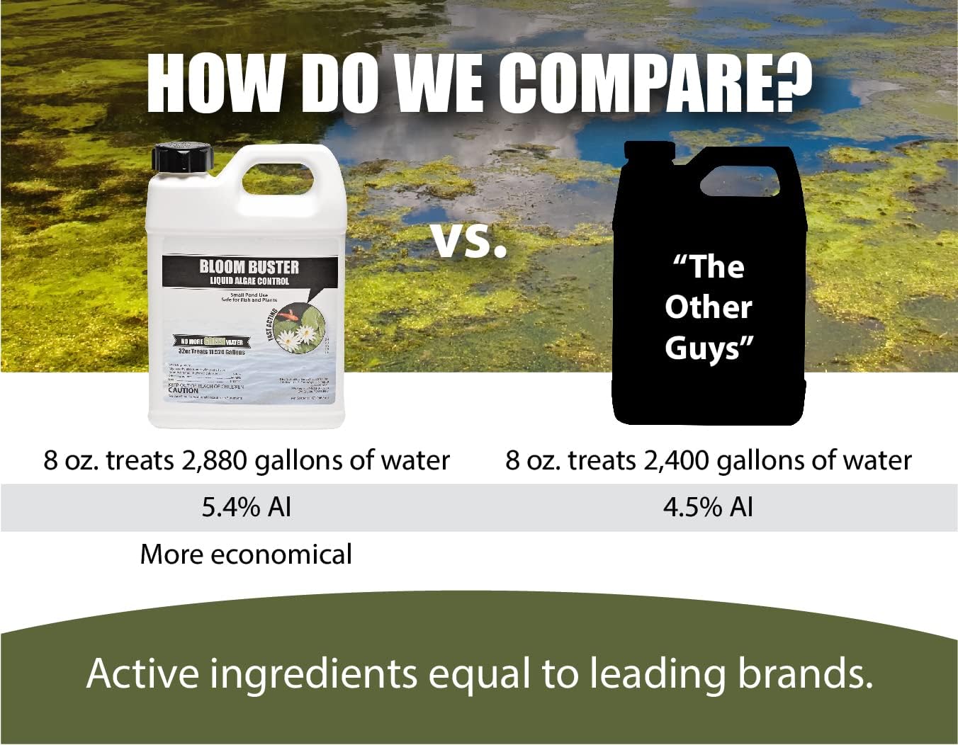 - For small ponds with heavy algae growth, clean the excess algae off the sides and ornaments before adding Bloom Buster Liquid Algae Control.