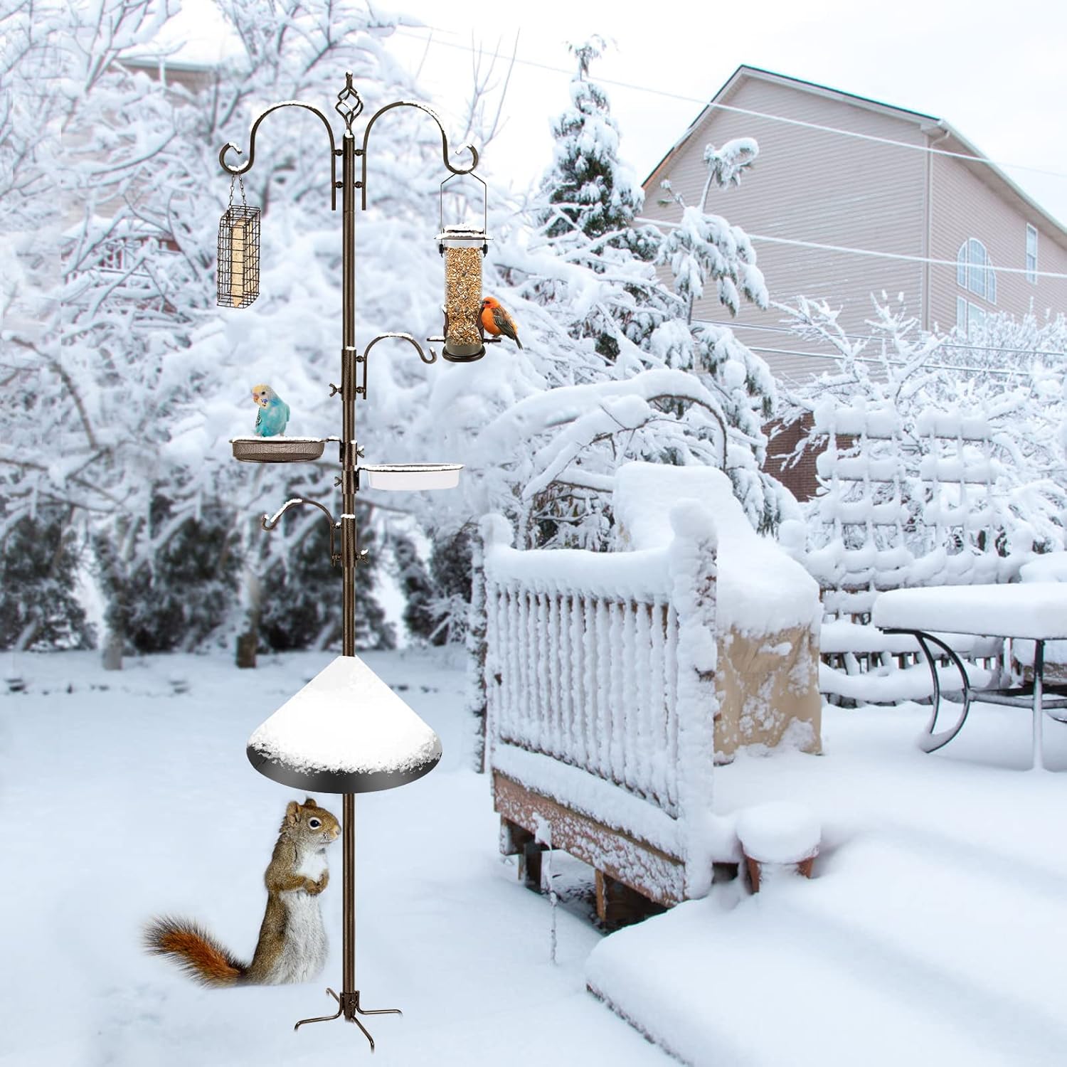 - PREMIUM QUALITY BIRD FEEDER HANGER: The 88.4-inch tall bird feeding pole is made of high-quality metal, and it comes with four different types of bird feeders that offer a variety of food to wild birds. The plastic water basins in the box make excellent bird pools, while wire mesh trays contain nuggets, suet, fruit, and even seed mixtures.