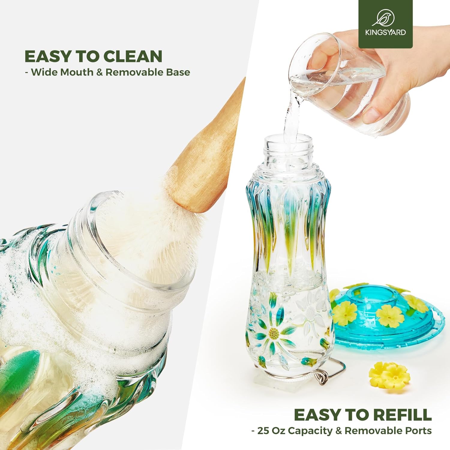 - 【EASY TO REFILL & CLEAN】Features clear glass and wide-mouth reservoir, making seeing and refilling nectar simple; The top of the 2-part base easily separates from the bottom for thorough cleaning; Regular cleaning will keep the feeder work better to attract lovely birds visiting