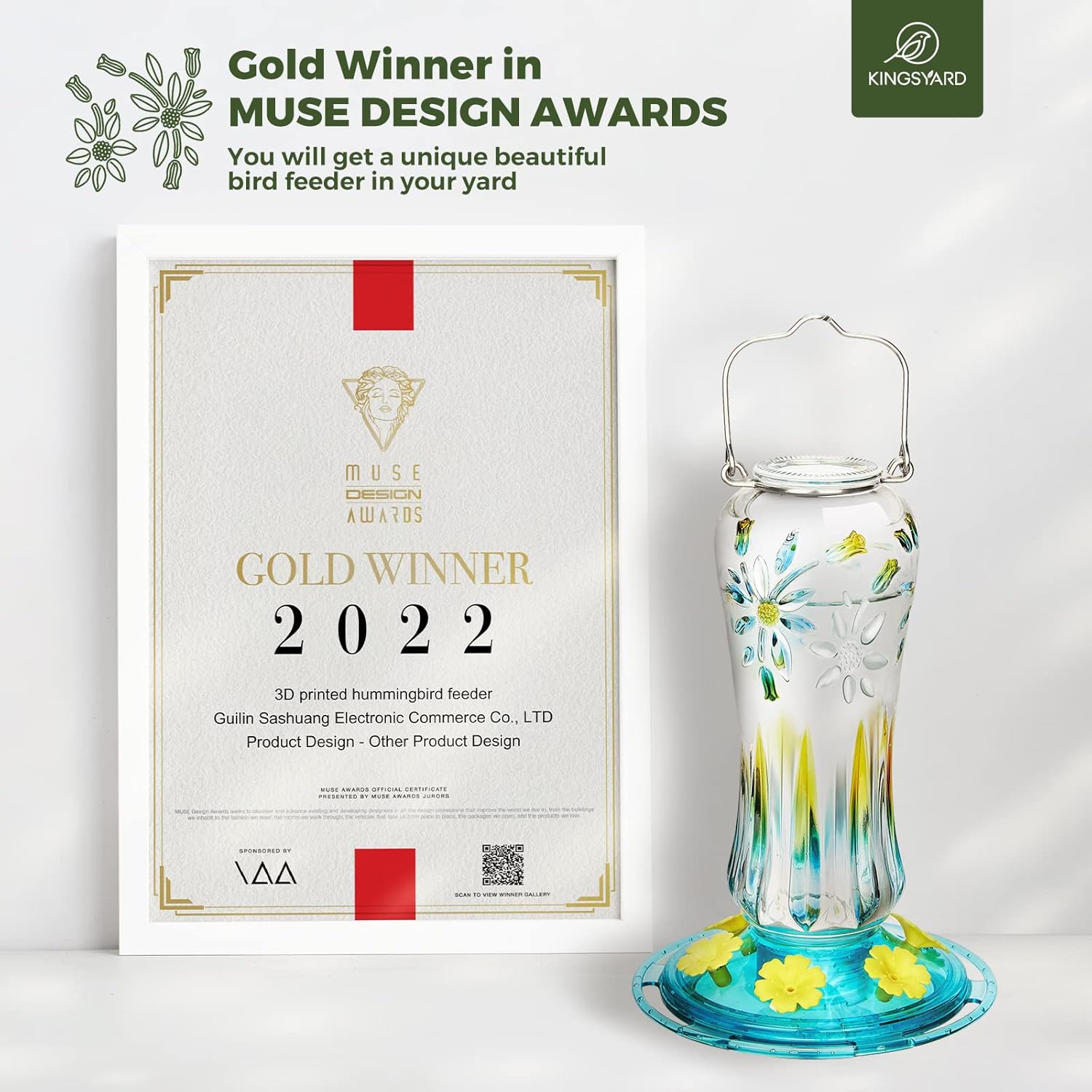 - 【GOLD DESIGN AWARDS】This Kingsyard Hummingbird Feeder is Gold Winner in MUSE DESIGN AWARDS; A sweet gift for parents, children and friends; A bird watching gifts for people who love birds; A unique gifts for Birthday, Mother's Day, Thanksgiving and Christmas
