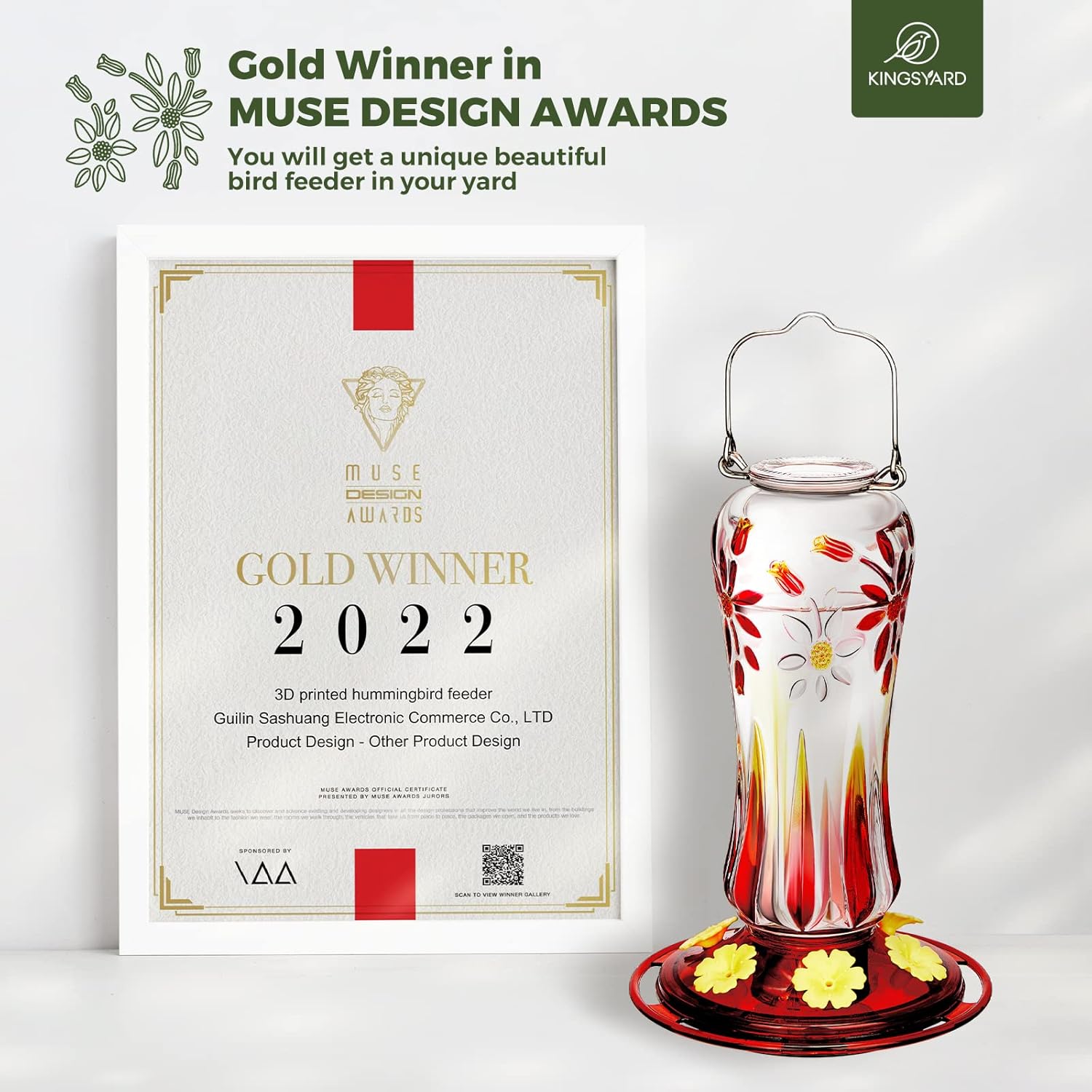 - 【GOLD DESIGN AWARDS】This Kingsyard Hummingbird Feeder is Gold Winner in MUSE DESIGN AWARDS; A sweet gift for parents, children and friends; A bird watching gifts for people who love birds; A unique gifts for Birthday, Mother's Day, Thanksgiving and Christmas