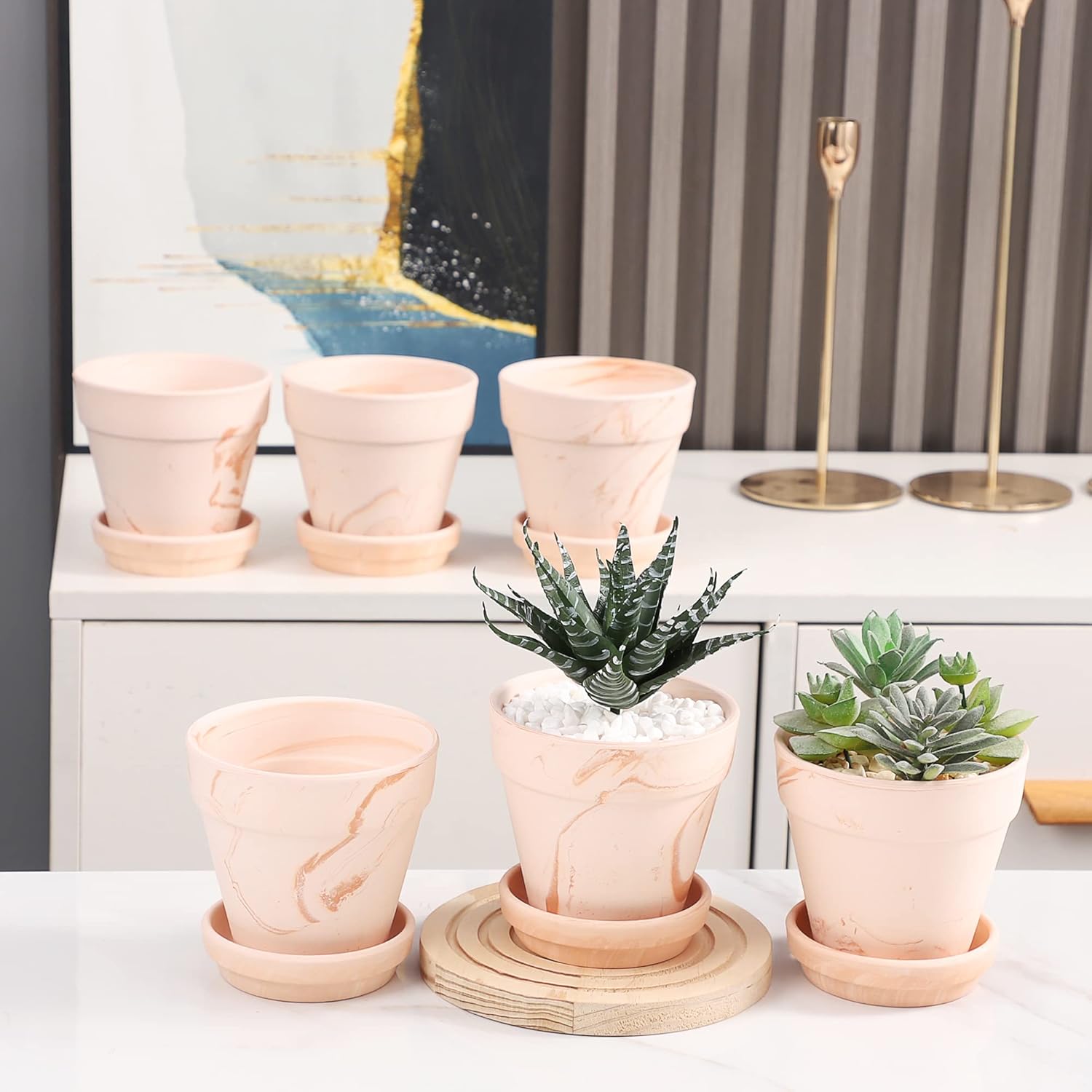 - ★【DRAIN HOLE AND SAUCER】 Each terracotta pot comes with a drain hole in the bottom to drain the stagnant water and and the matching ceramic saucers can catch small amount excessive draining water and dirt to keep it clean. The clean flower pot looks great in apartments on coffee tables, modern home decor, offices, and dorm rooms. One set has 8 pcs pots and 6 pcs saucer, enough to propagate different seeds and use for a different DIY project.