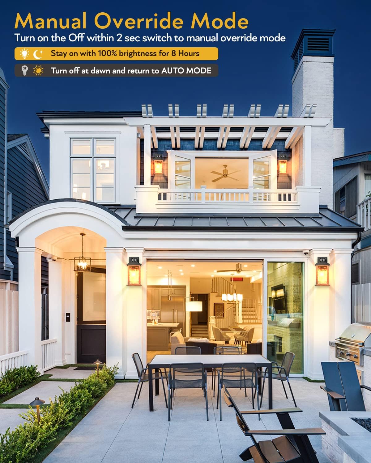 - ☀️【New Sensor】The motion sensor light has been completely upgraded. Our outside lights for house have 3 lighting modes; just press the button to achieve one-touch switching mode. ① Dim mode: 30% brightness when there is no motion, 100% brightness when motion is detected. ② ECO mode: 100% brightness when motion is detected, 0% brightness the rest of the time. ③ Override Mode: continuously lighting for 8 hours at night. The 3 modes automatically turn off the exterior light fixture when dawn comes.