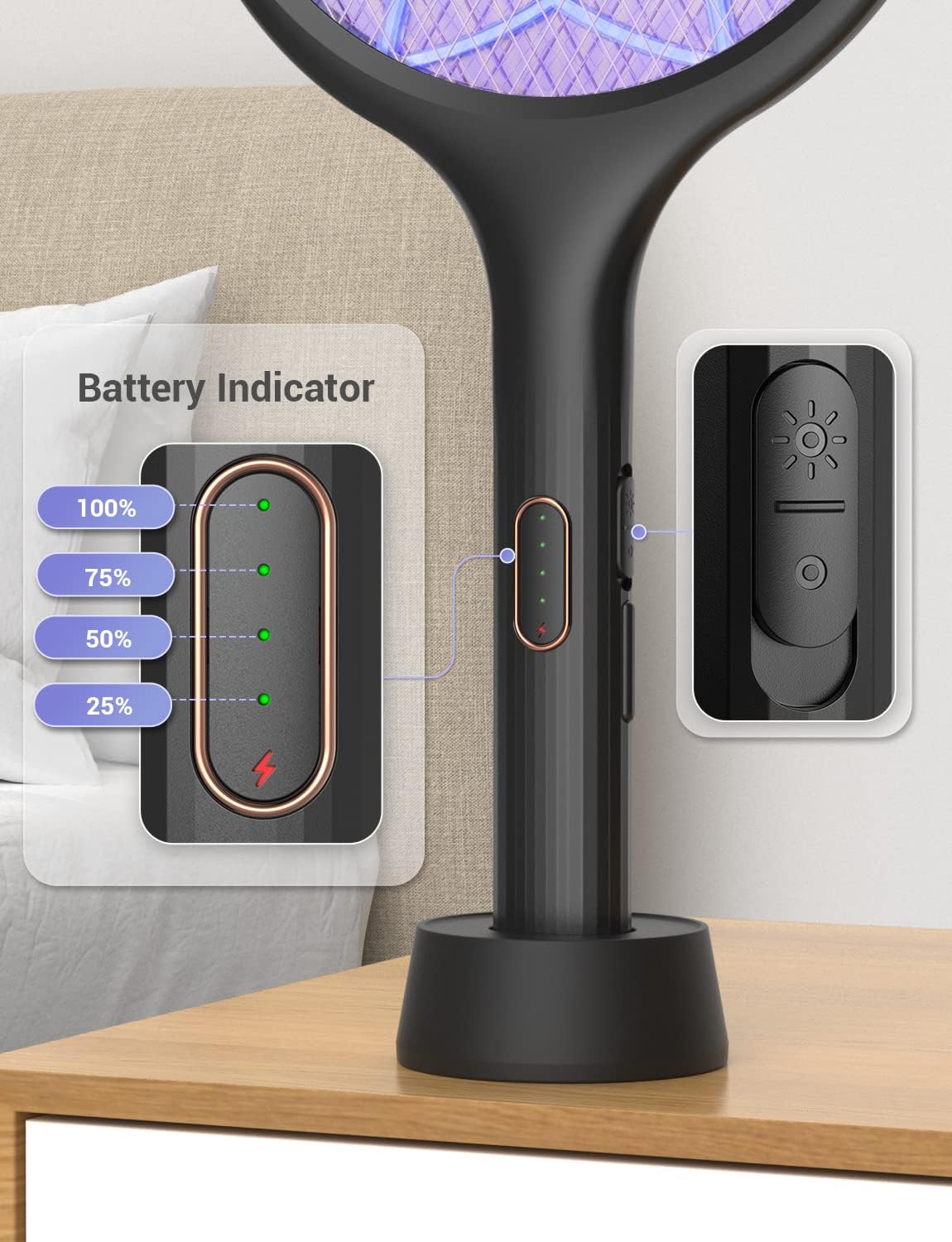 - (Convenient Auto Zap Mode Fly Zapper Racket) Turn YISSVIC mosquito swatter on, sit it on the base. The bug light of electric fly swatter racket will attract the pests and fry them to a crisp