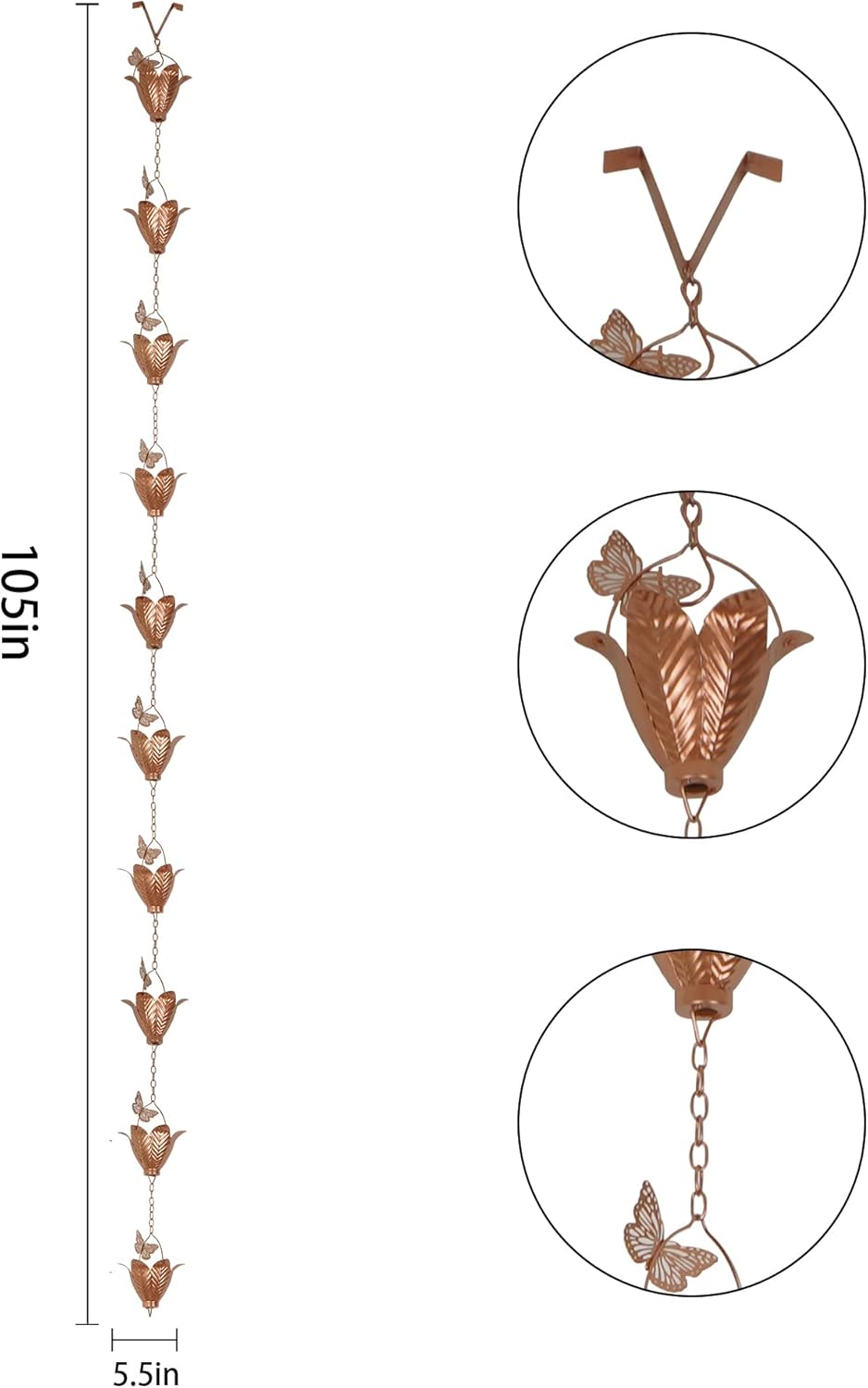 - 105" Long for Universal Fit. Include 10 cups. This rain chain combines decoration and function replacement of ugly rectangle downspout gutter.
