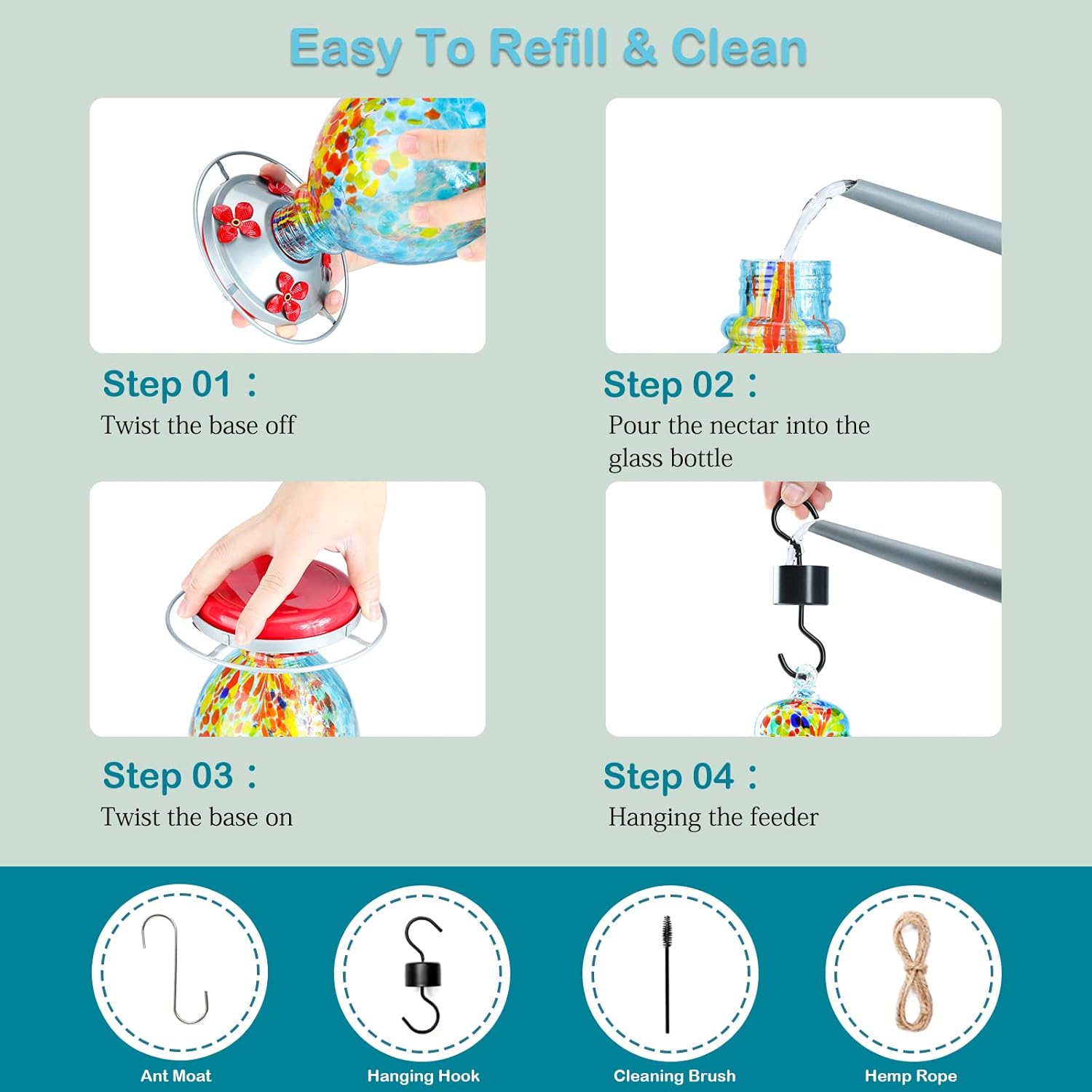- Easy to Fill and Clean: With a wide mouth design and simple structure, it's very easy to refill nectar and also convenient to clean with a bottle brush. Transparent glass makes refilling and seeing the feeder with nectar easy